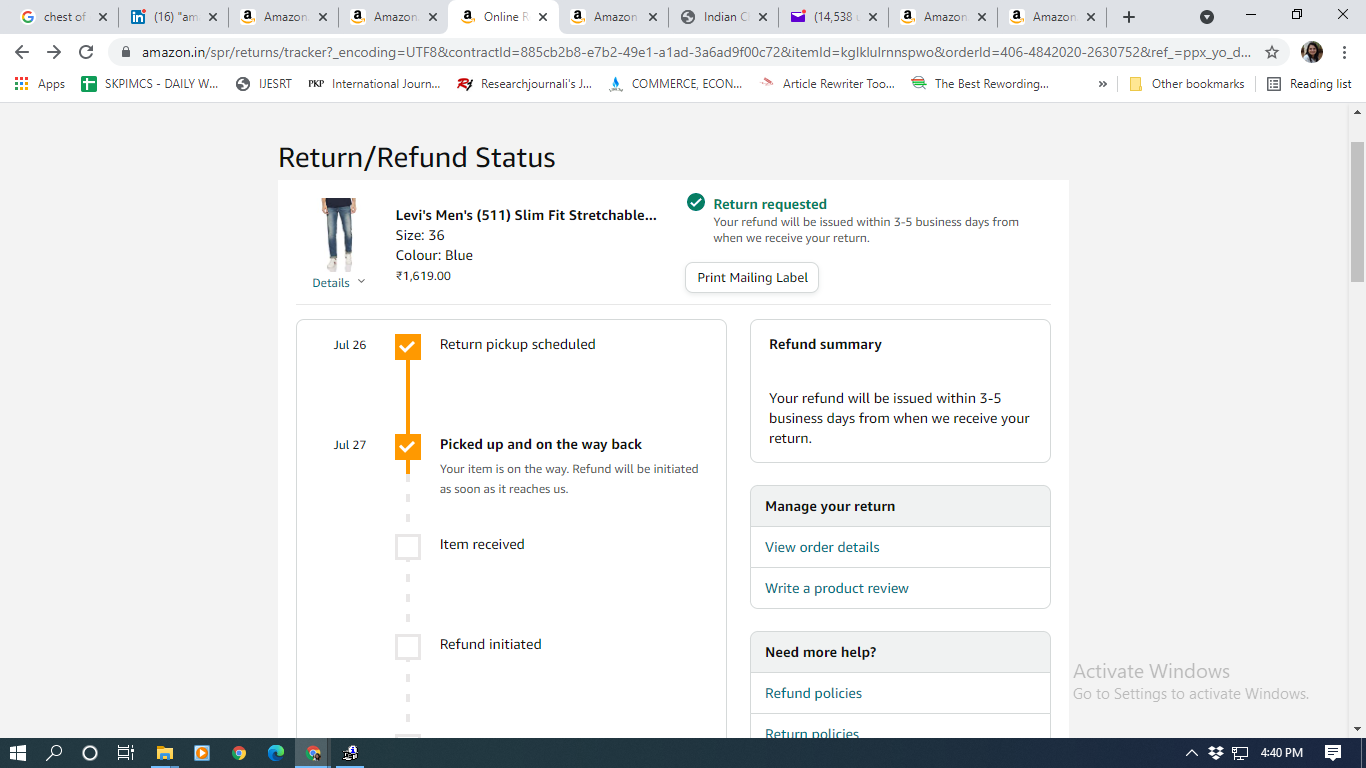 I have not received the refund for Levi’s Men’s (511) Slim Fit Jeans (18298-0516_Blue_36W x 32L) which was picked up from my place on 27/7/2021.
