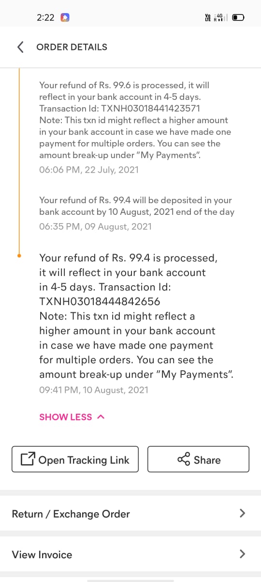 I had placed my order on 13 July I had ordered 2 raincoat and which I didn’t like so I had placed for refund and only one raincoat I got refund and from 22 July to today is 14 aug I had not received my refund of 2 raincoat