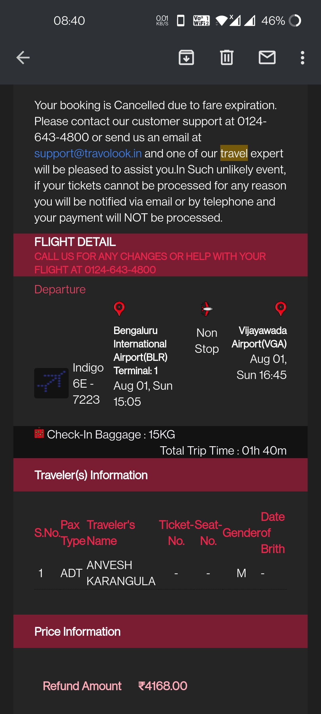 I booked a ticket on 26th July with reference no: REF405878738. Ticket got cancelled from their end and it was mentioned that it was cancelled due to operational issues. I didn’t get any refund till today (22nd Sep) and I am not able to reach their customer service number. There was no resolution given even though I mailed them 10-12 times.