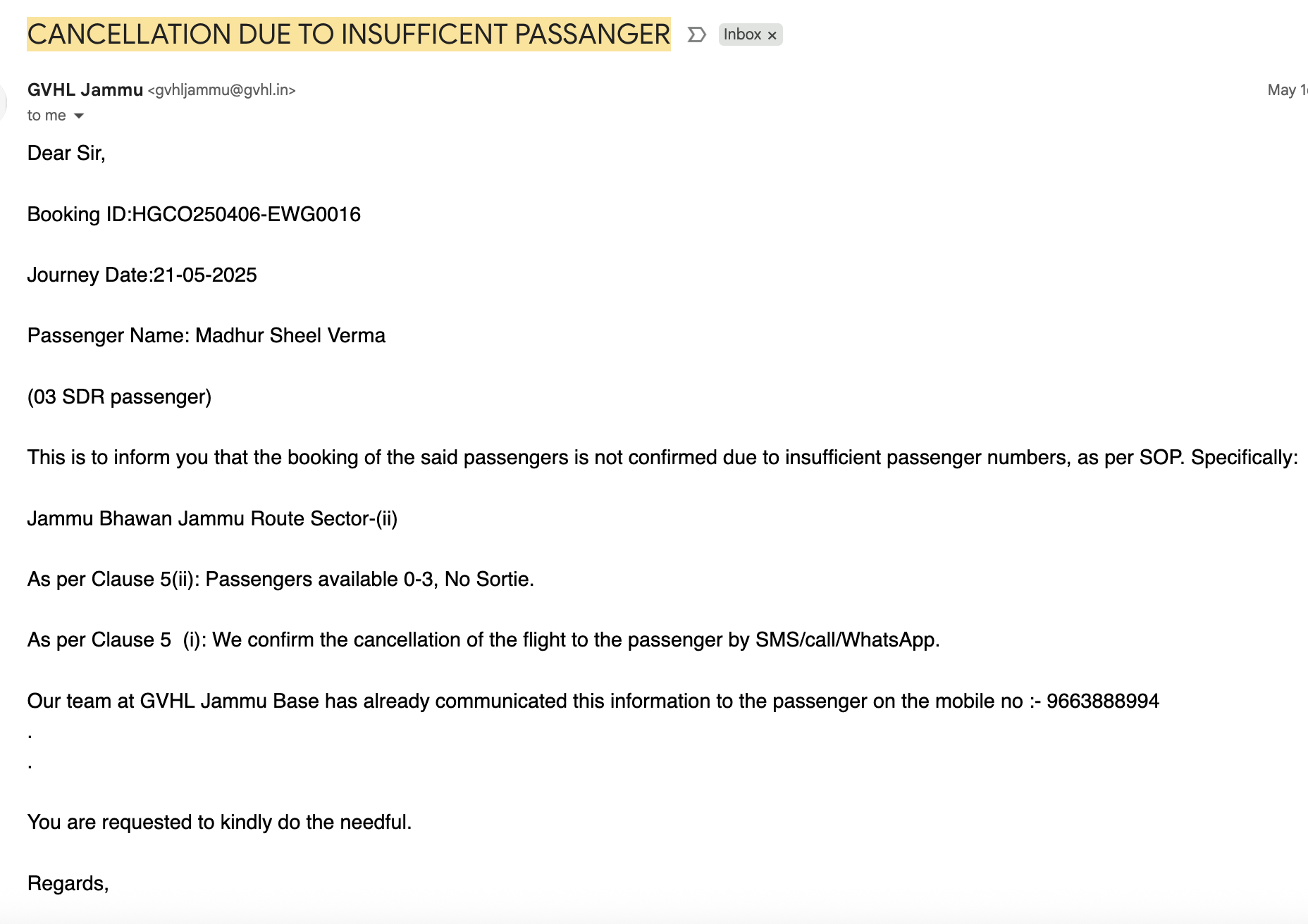 Few weeks later, I received a phone call and email from global Vectra team that they will initiate a cancellation because sufficient number of passengers are not there on that day to continue with the booking.