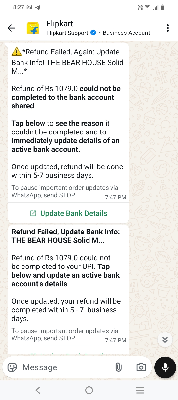 Sir my pickup done by Flipkart delivery boy in 17Nov2025 till date 3 days completed yet payment is not refunded.also they blocked my account after pickup now they send massage on WhatsApp.that says change the activate bank account details but I m not able to login.please help the issue and solve this thanks ๐
