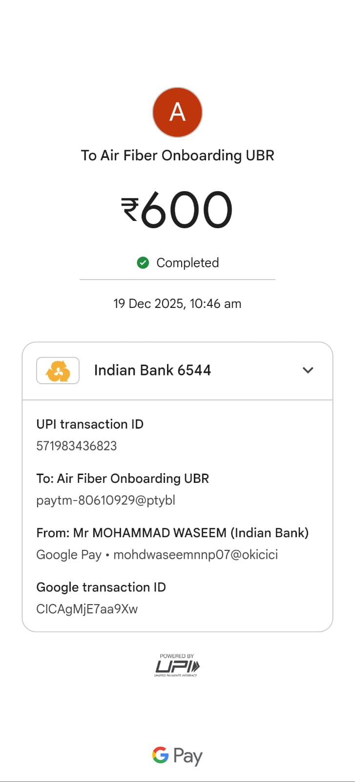Maine 19/12/2025 ko New Air Fiber Connection Ke liye jio team Anshu Tripathi district Bahraich ke duwara kyc karwakar 600/- Rupees google pay se payment kar diya tha jis ka order no. NO0001AITN6K tha.Technical fault ke karan worn building aa gaya aur conention faild ho gaya, jio team Uday ne conection ko wrong bata kar 19/12/2025 ko hi cancelled kar diya . Jis ka Refund abhi tak account me wapas nahi aaya hai .G.pay transaction id- 571983436823 date -19/12/2025 Registerd mobile no. 9451096511