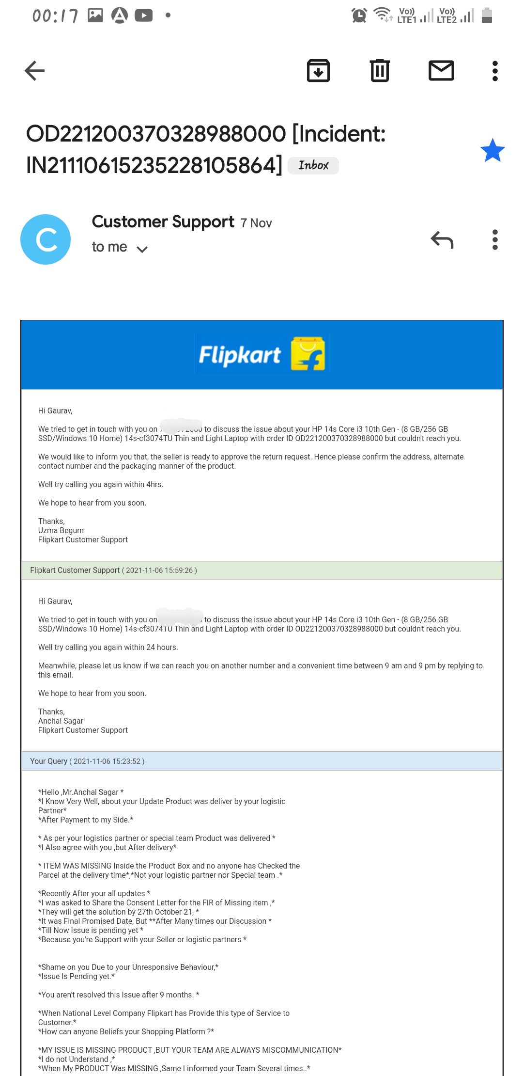 I was asked to wait 12 days and share the Id proofs and Consent letter for the FIR Raise of the Missing product