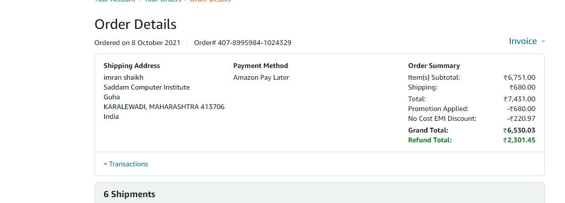 i order total 6 diffrent products on 8 oct 2021 and return all item to delivery time product return successfully bt not get full amount return show in attachment i already talked 5 times to customer services but not get my refund so i wll complaint against amazon