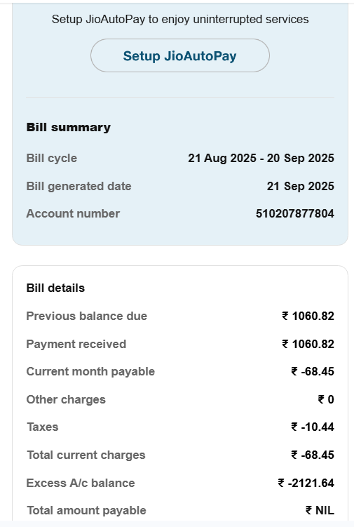 I was using Jio Fiber internet service from Aug 2022 till mid Sep 2025, due to poor support provided by them I disconnected Jio Fiber service after 3 years. I paid for 3 months advance rental during my Jul-Aug billing cycle which is till Nov 20th, 2025. Since I disconnected the service during mid of Sep I am requesting a refund for the 2 Months advance amount I paid (Rs 2121)