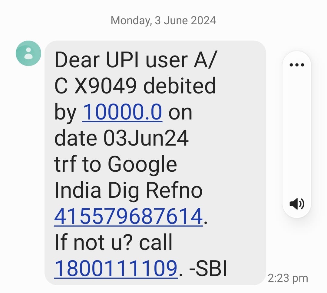 R/s a sum of Rs. 10000 has been wrongly transferred to Google India Digital as reference no 415579687614 on dated 03/06/2024 from account no 30777879049 Narender Kumar, i request please take necessary action and refund my deducted amount