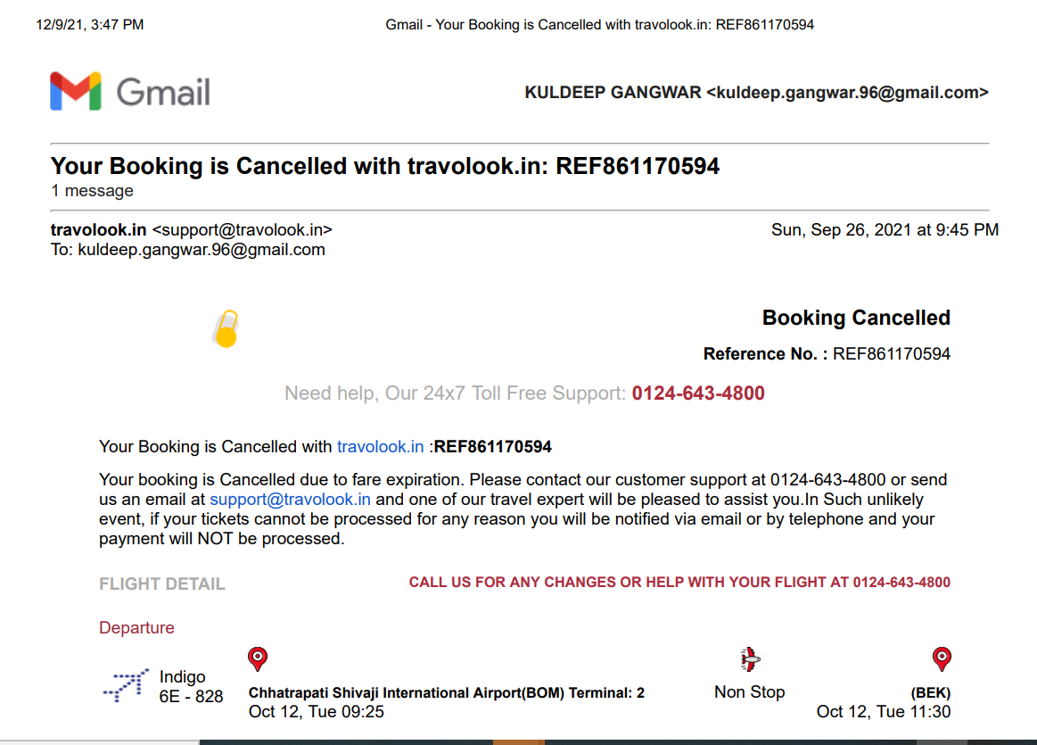I tried to book a flight on oct 12, 2020 from Mumbai to Bareilly – 6E 828 through TRAVOLOOK. As I completed the payment, I received a mail stating that my booking is in progress. After few hours, I received a mail stating that my ticket has got cancelled for some reasons and i will get my refund with 15 days.