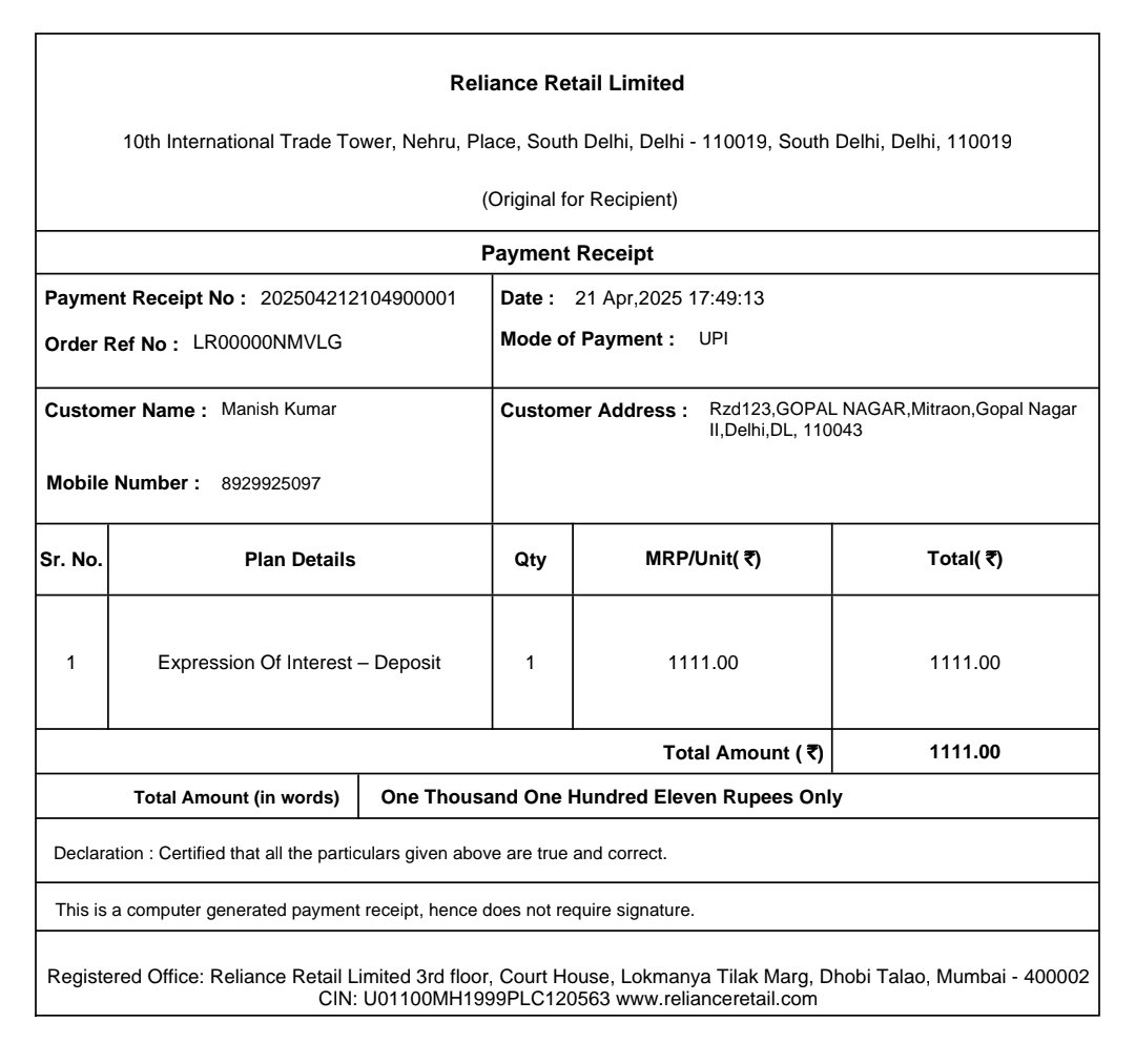 This is regarding the installation of Jio Fiber at my new address following a relocation request raised on April 21, 2025 (Order Reference No: LR00000NMVLG). I have already paid an amount of Rs. 1,111, as per the attached invoice copy.