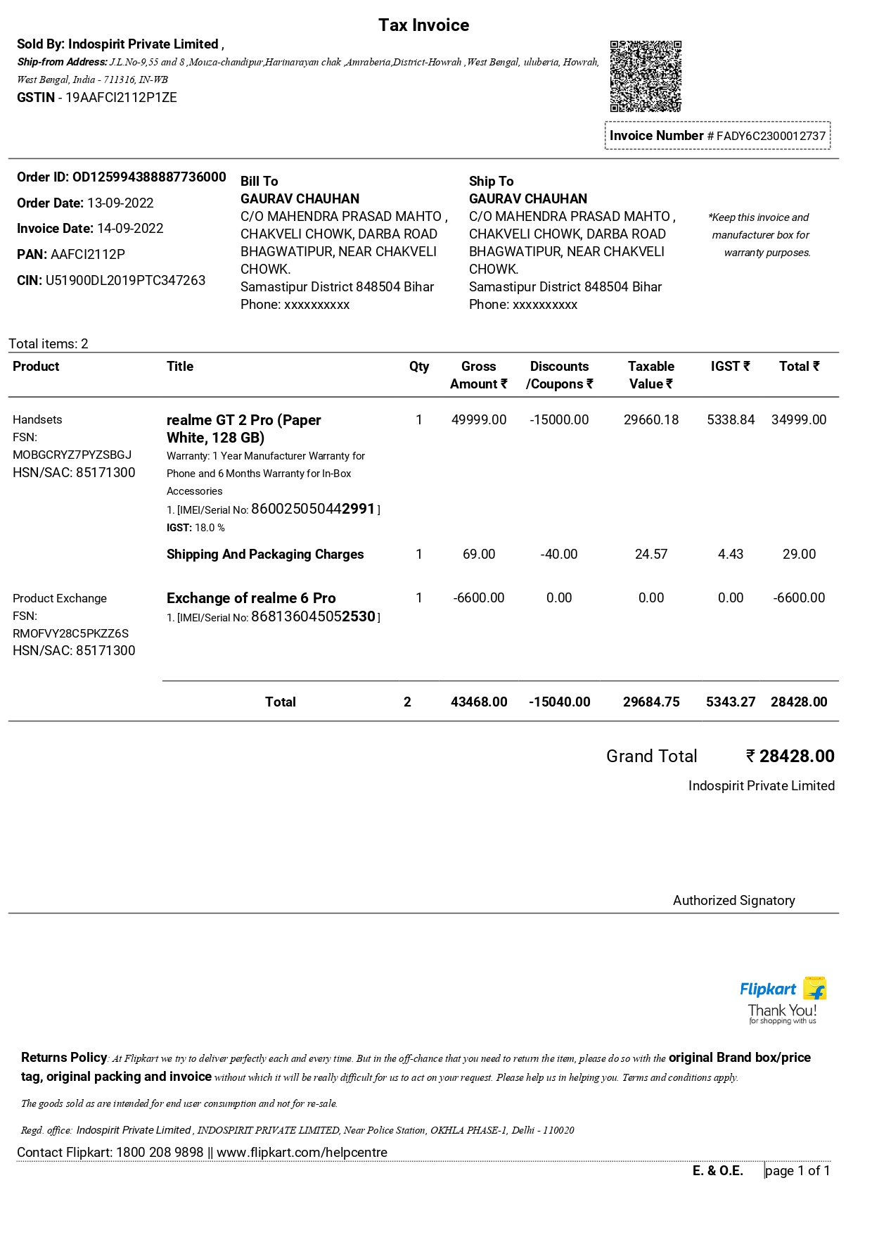 Again I booked Realme GT 2 Pro (Paper White ,128 GB) Order ID:OD125994388887736000 as on 13.09.2022 by prepaid payment .We faced the same problems even on the order of 13.09.2022 .Even in this order you were not delivered on time and were promised many times . Due to your false promise our total idle or waiting period is 19 days .