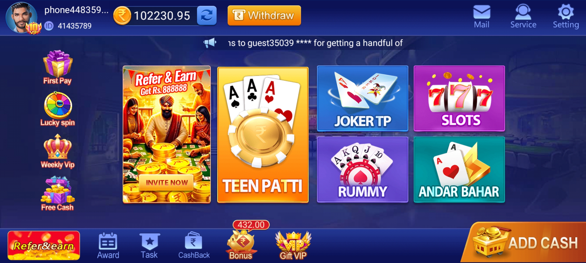 I downloaded the Lucky Teen Patti app from the Play Store and started playing. Initially, I won some games, but then it asked me to recharge to withdraw my winnings. I recharged my account to withdraw my money, but then it asked me to reach VIP level 10 to withdraw. Even after reaching level 10, I’m unable to withdraw my money. I’ve recharged over Rs. 1 lakh, but I still can’t withdraw my funds.
