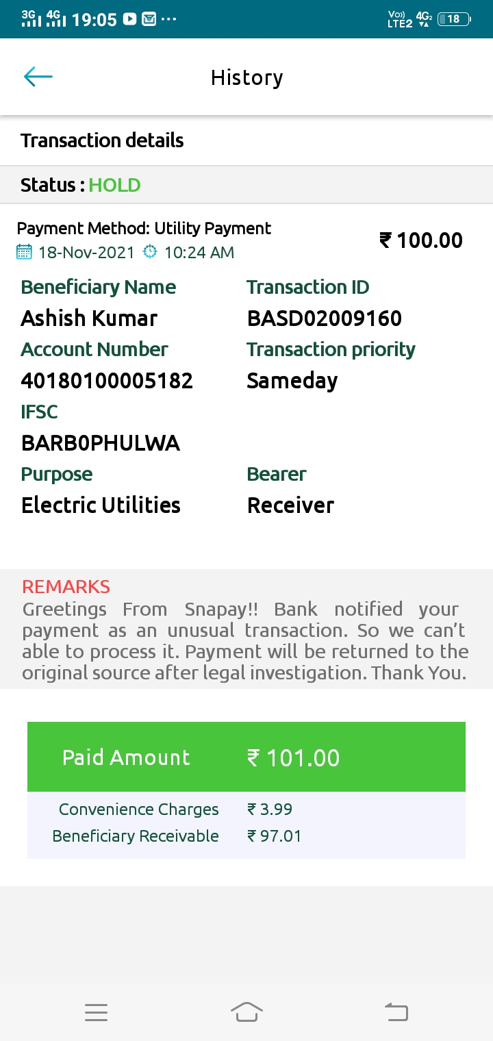 Dear Team, I have send Amount of Rs. 101 from Amazon Wallet To Snapay App To Transfer Amount To Bank Sameday, Transction Sucessful from Lazypay and In Snapay App Transction Status: – Payment Hold but It’s been more than 7 days they are not Refunding my Money Please, Resolve My Issue