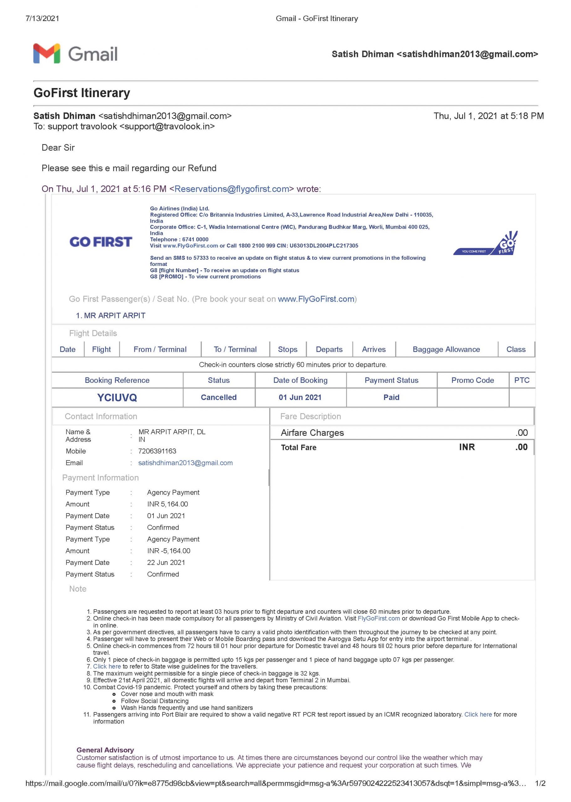 As per my communication with Goair they told me that they have transfer the refund of Rs. 5,164.00 in the Travel Look account on 23rd June 2021