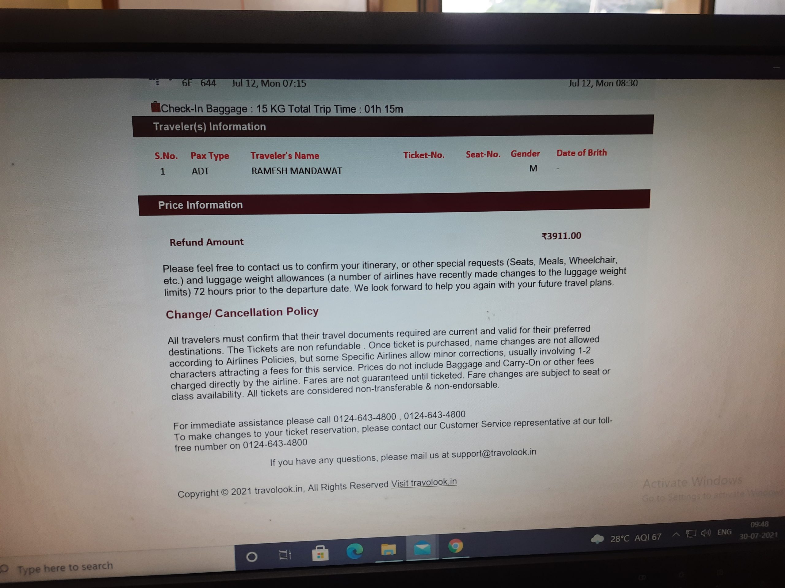 I booked flight ticket from jaipur to Ahemedabad on Dt 9th July 2021 at 3.33pm for Boarding Dt. Dt. 12th July 2021 by Indigo through Travolook .com and ticket is confirmed reference No. is 542653907 ,but after some time message came the Ticket has been cancelled Refund will be returned 100% , Rs. 3911 but still now my refund money Rs. 3911 not come . Sir Kindly requested to help for providing my money . I have mailed but not responding of mail and telephone.