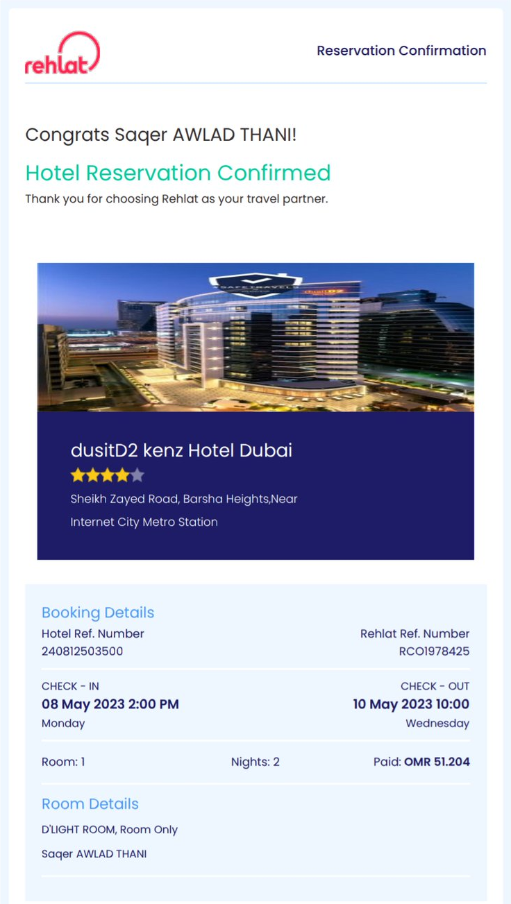I have booked a room for 2 nights in dusit d2 kenz hotel, dubai through rehlat.com, the booking was to be from 8/5/2023 to 10/8/2023 and was done on 7/5/2023 under this rehlat ref number: RCO1978425, and the total amount was 51.204 OMR (please refer to the first attached photo).