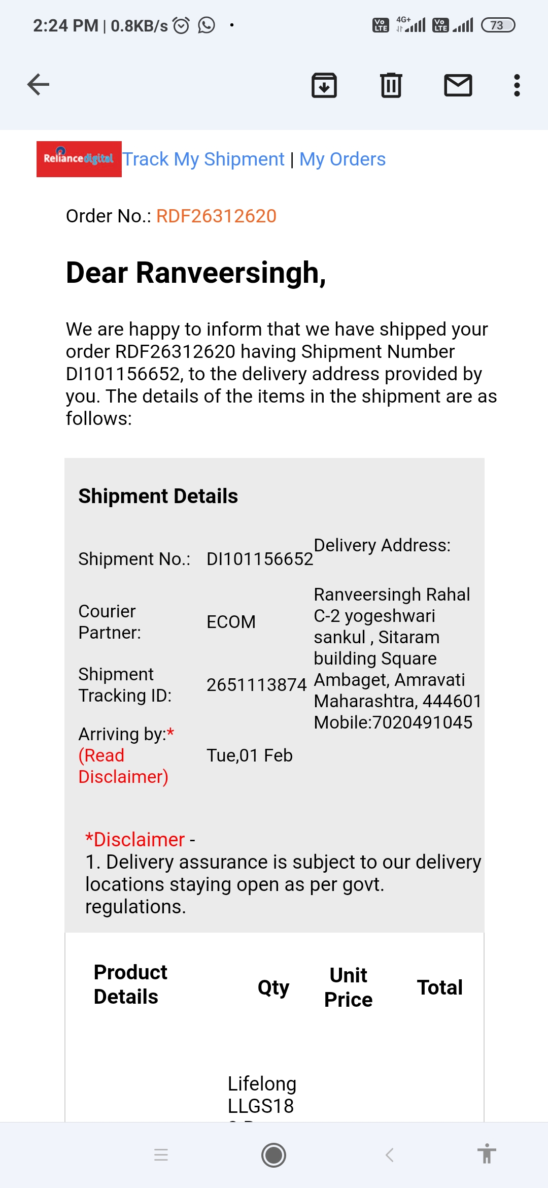 Reliance digital Store app in , I was online booked on date 26\01\2022 lifelong LLGS 18 3 burner cooktop with manual ignition but not yet delivery my products and I paid total amount 2049 Rs and not yet reply me any information . My Clem for products and My money using 19 days