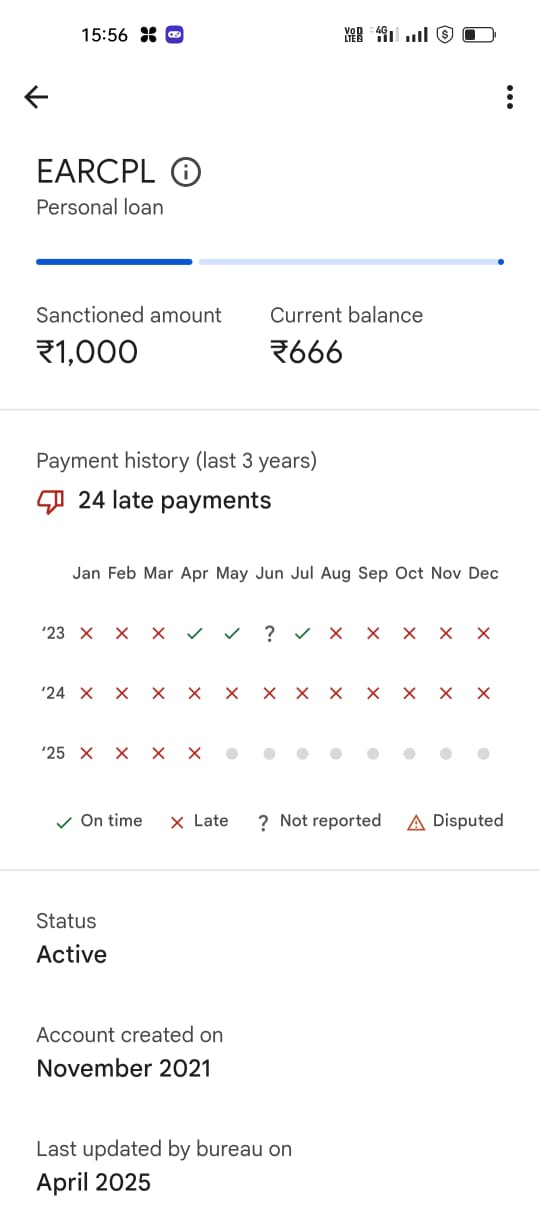 I haven’t received and used any personal loan from EARCPL. However, it is showing in my Cibil score purchased overdue amount Rs.666
