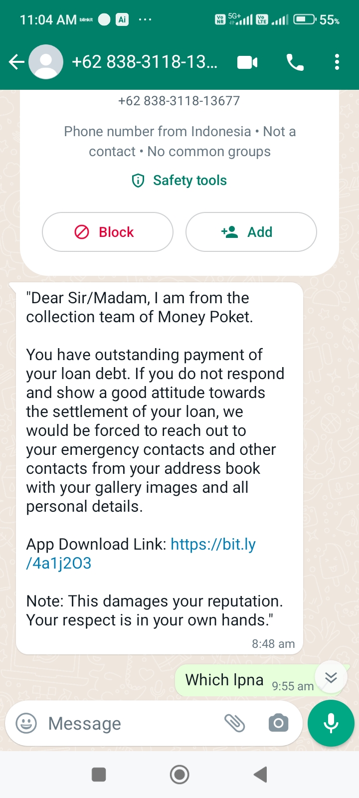 A mobile number +62 838-3118-13677 textimg me on whatsapp that I have taken loan from moneypocket but I did not took they are threating me to voilet my privacy through image and contacts number
