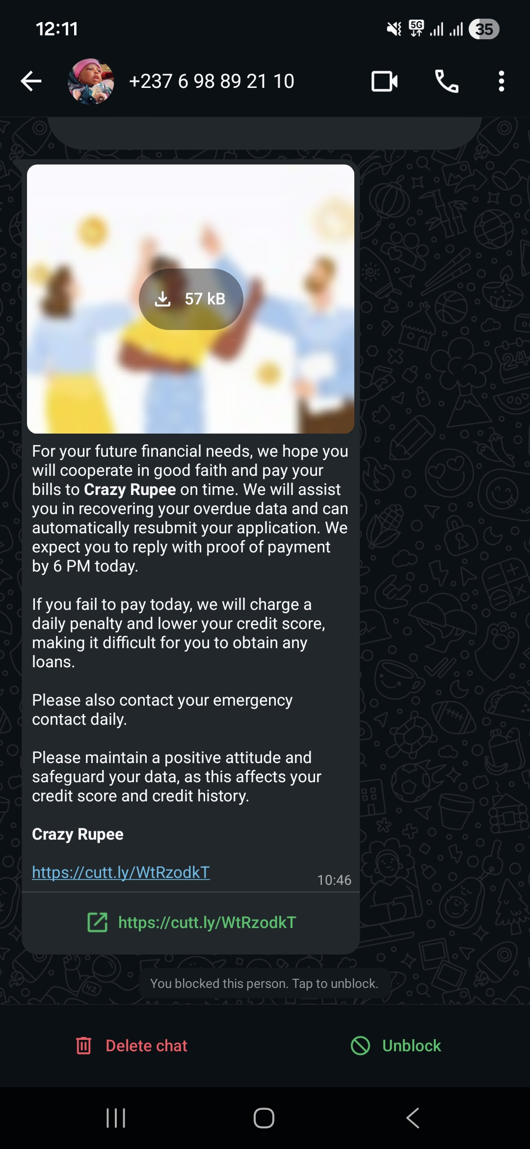 I m receiving whatsapp messgaes to repay loan, which i never took. They r saying that i took loan from crazyrupee and pay today. But i didnt take any loam from it. Its harrasing. Ss of chat is atatched here with.