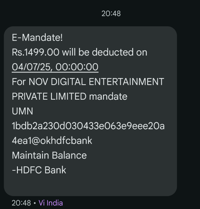 I received an e-mandate from Nov Digital entertainment private limited for approving payment towards my hotstar recharge which is due tomorrow so I check the company name and came to benow that the above mentioned company is sending such messages to scam.