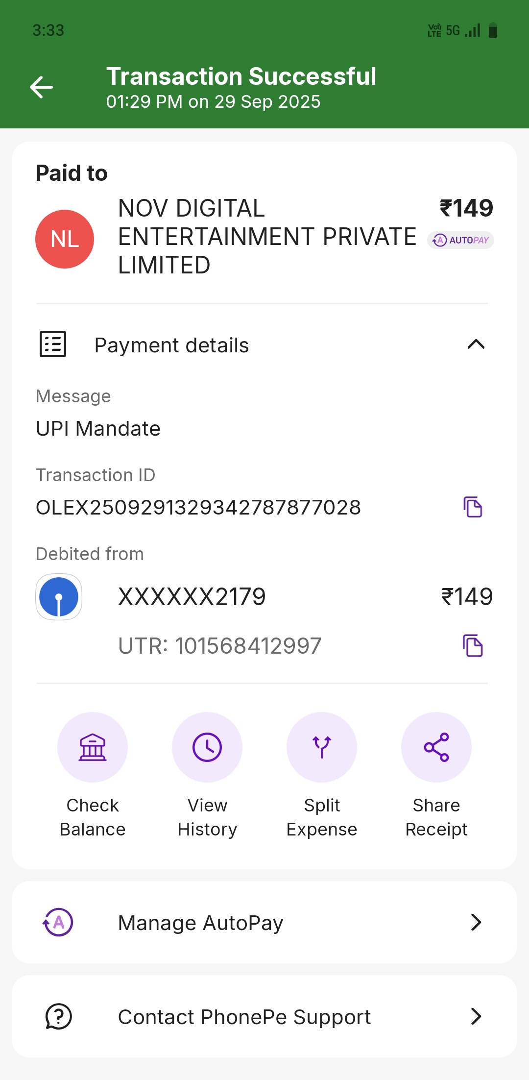 I noticed that ₹149 has been auto-debited three times from my account under the name NOV DIGITAL ENTERTAINMENT PRIVATE LIMITED through UPI AutoPay, even though I have not used or accessed your services during this period.