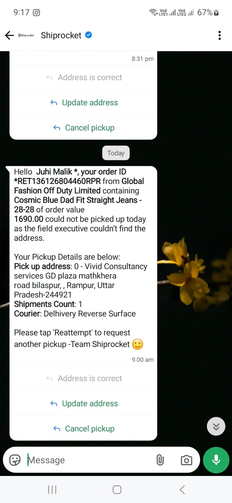 I ordered a pair of jeans from Off duty India on 11th March 2025, and received it on 21st march by paying 1790 rupees. Due to size issue i placed a return request on the same day i.e. 21st March 2025. and next day I received a message from pickup agent service i.e. Shiprocket that my agent will pick up my order on 22nd March 2025. after waiting whole day, I received a message that customer cancelled the pickup, but I didn’t even receive any call or anything from agent. Then i raised a complaint to off duty India and they told me that they reschedule the pickup. On 23rd March 2025 again i received a pickup message but again pickup agent did not attempt the pickup and mention address was not found. again, i raised a complained and again they tell me for reschedule pickup. on 24th march same thing happens with the pickup. and they are not even assisting me properly now.
