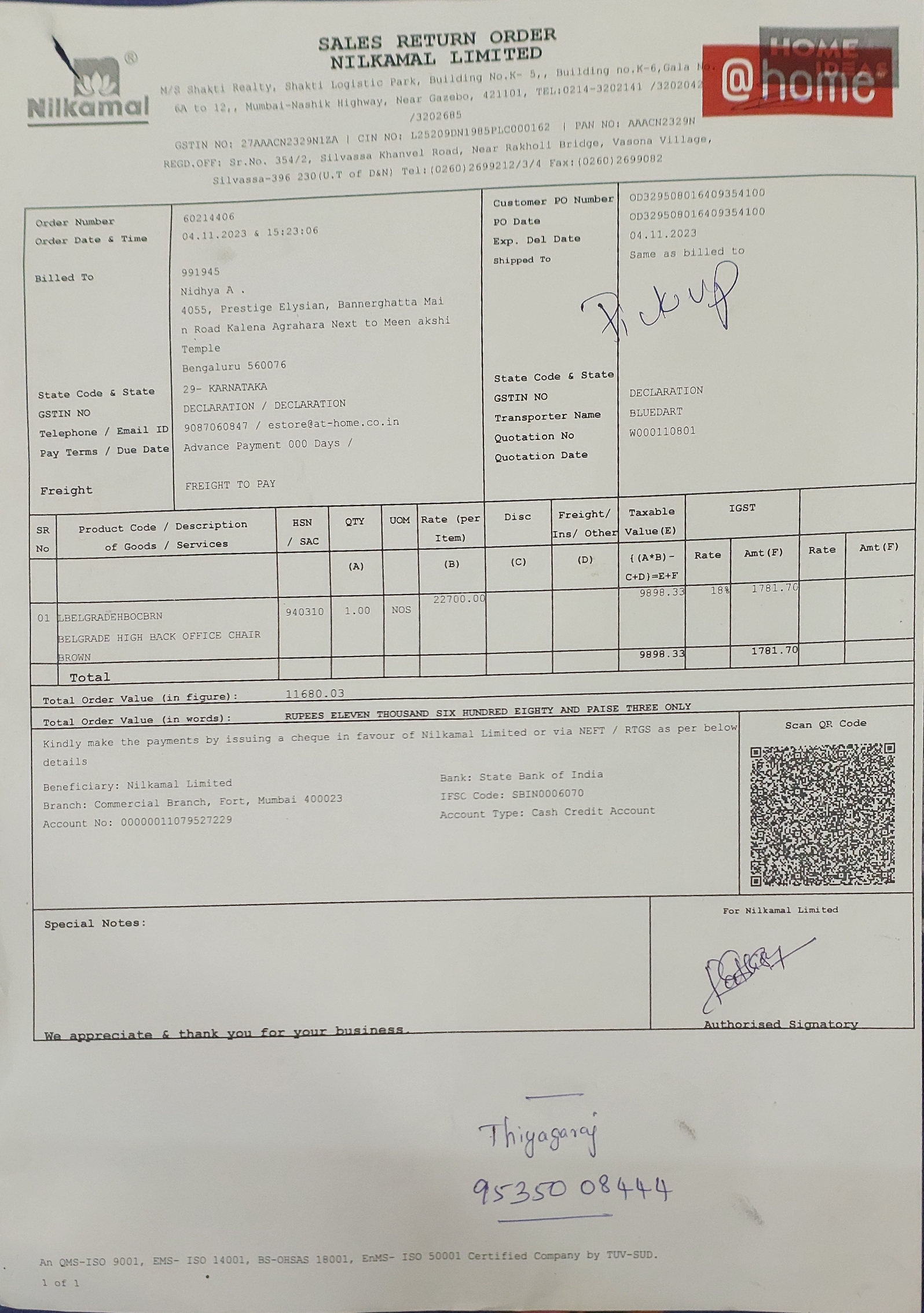 I personally validated the return order with Nilkamal and they confirmed the product has been returned. Because of the same model not available in the warehouse, they can’t provide the replacement. Furthermore they have provided the update to Aftab Jaipuri – Merchant manager – Nilkamal and Flipkart and expect the issue to be resolved soon. Attaching the return sale order for your reference.