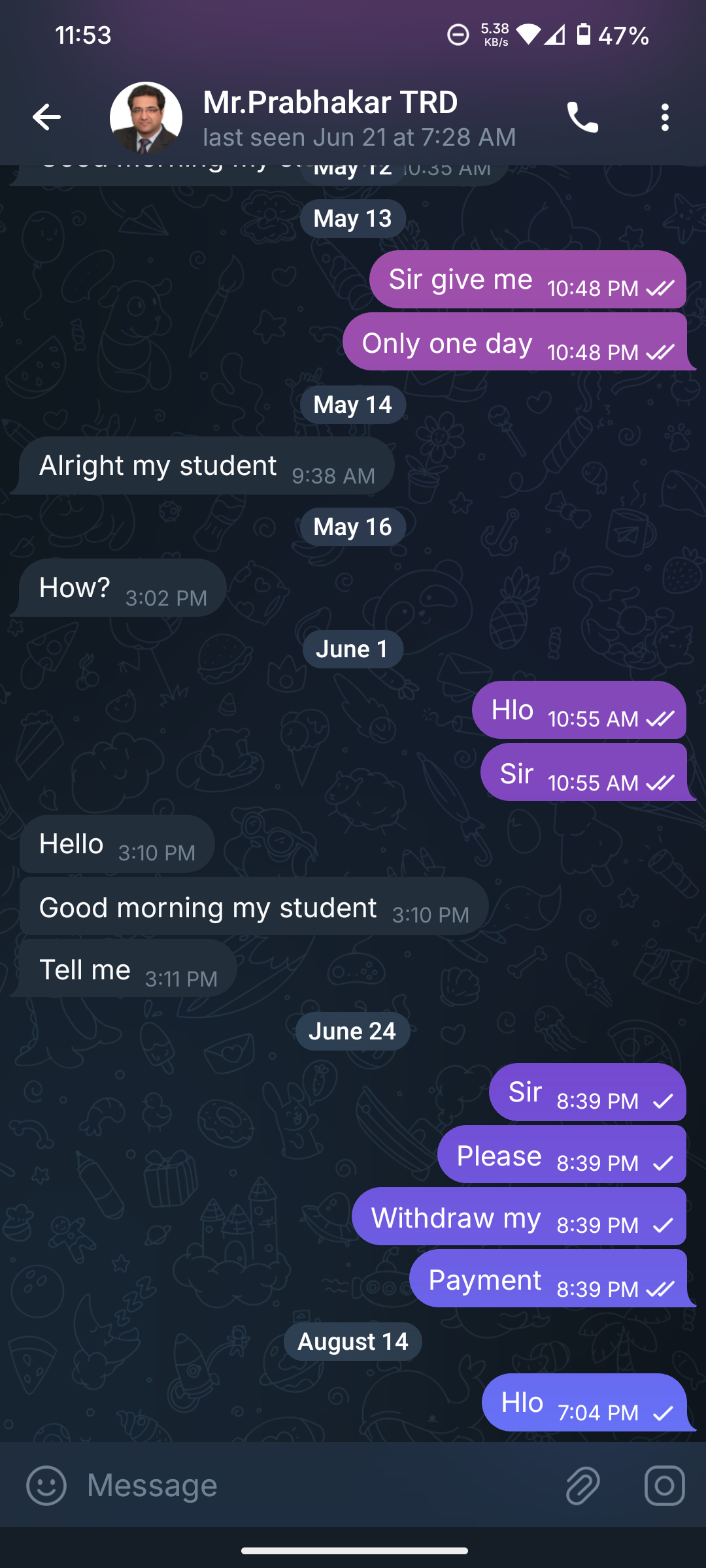 One day I got msg from a person who says there is easy way to earn money thy give me 250 rs first day then I trust on him but thy ask invest 1000 and get 2500 I invested thy give me 2500 but thy ask pay 5000 and get 8000 I send it and then thy says send 22000 and get 43000 I want my money back then I send it but thy says you are in loss u can send 25000 more to get back your money they scammed more then 50000 rs from me