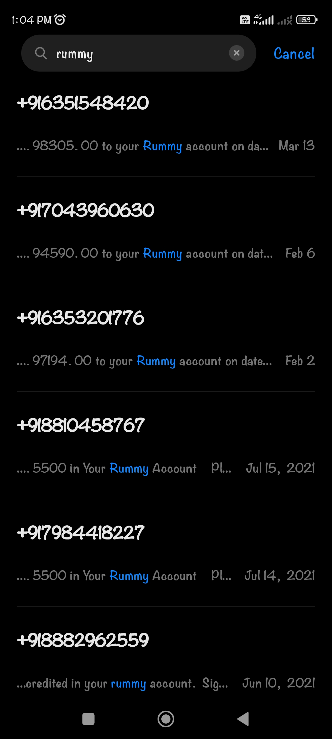 Hi..I want to complaint regarding rummy account. As many a times I got a fake message for winning amount as below