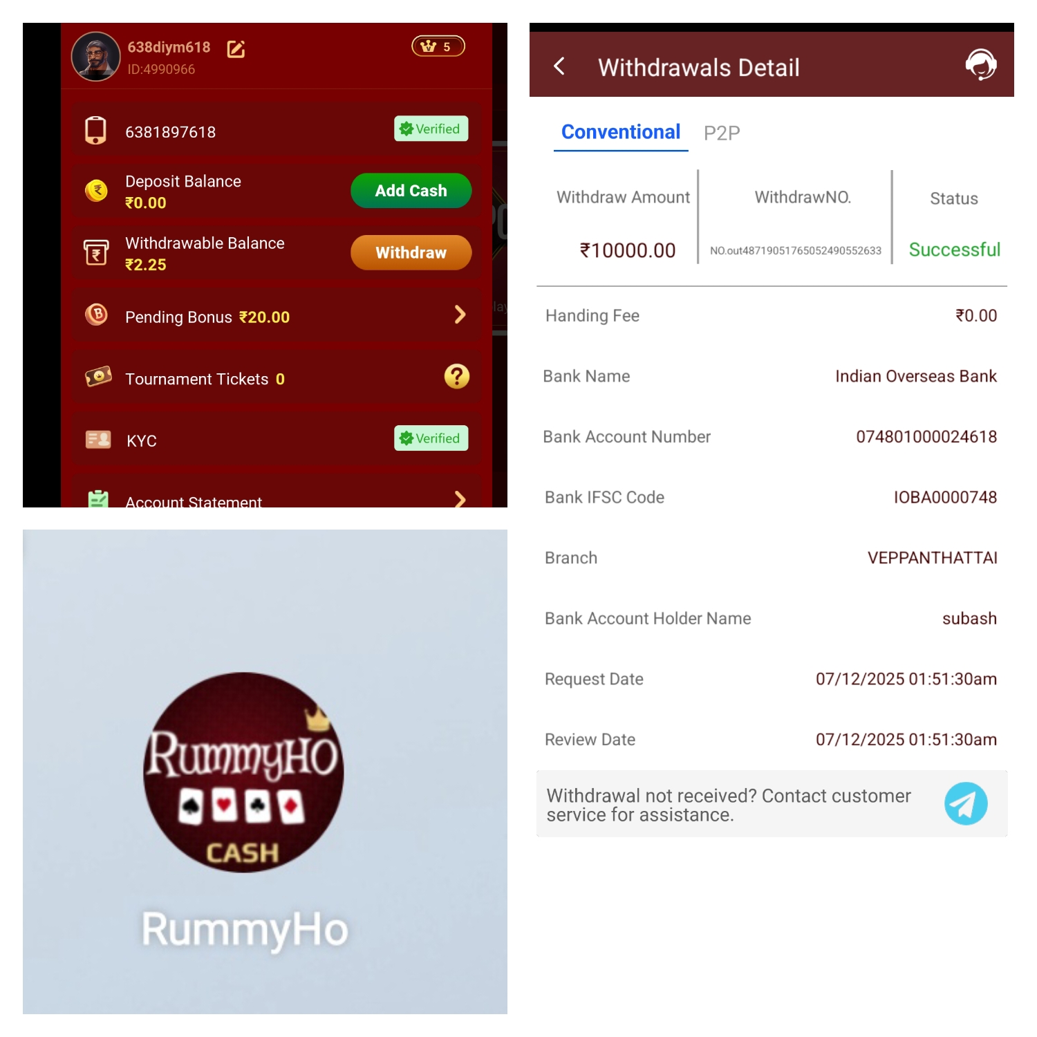 Rummyho 07/12/2025 amount withdrawal amount successfully not received my account game side no response amount very loss please help 10000 sir costemer Care no response sir