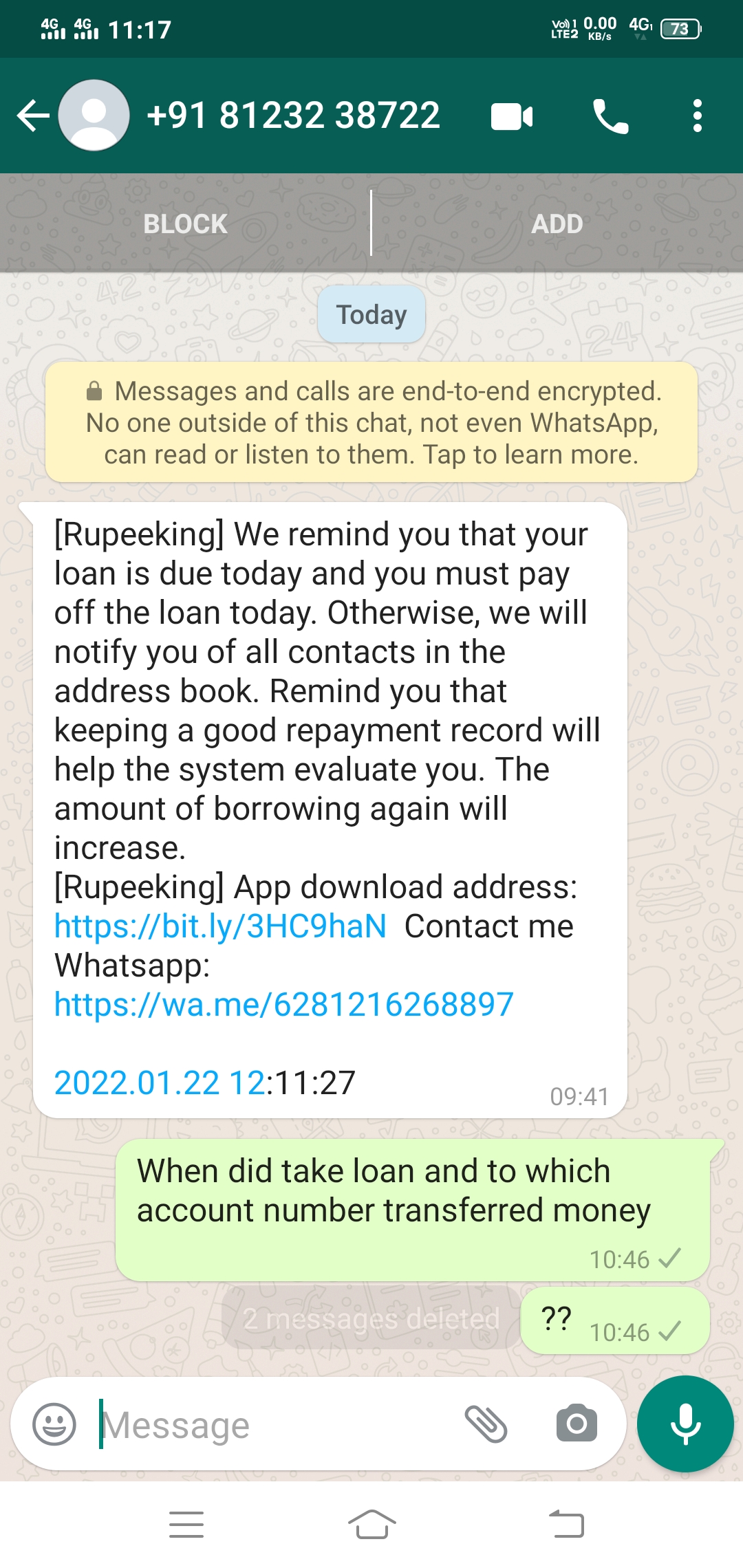 I have received msg in WhatsApp asking me to pay the loan where I haven’t applied for any loan and that app is not in playstore also. They are threatening like they will contact my contacts book. Please help to take necessary action against them and save the people from these scammers.
