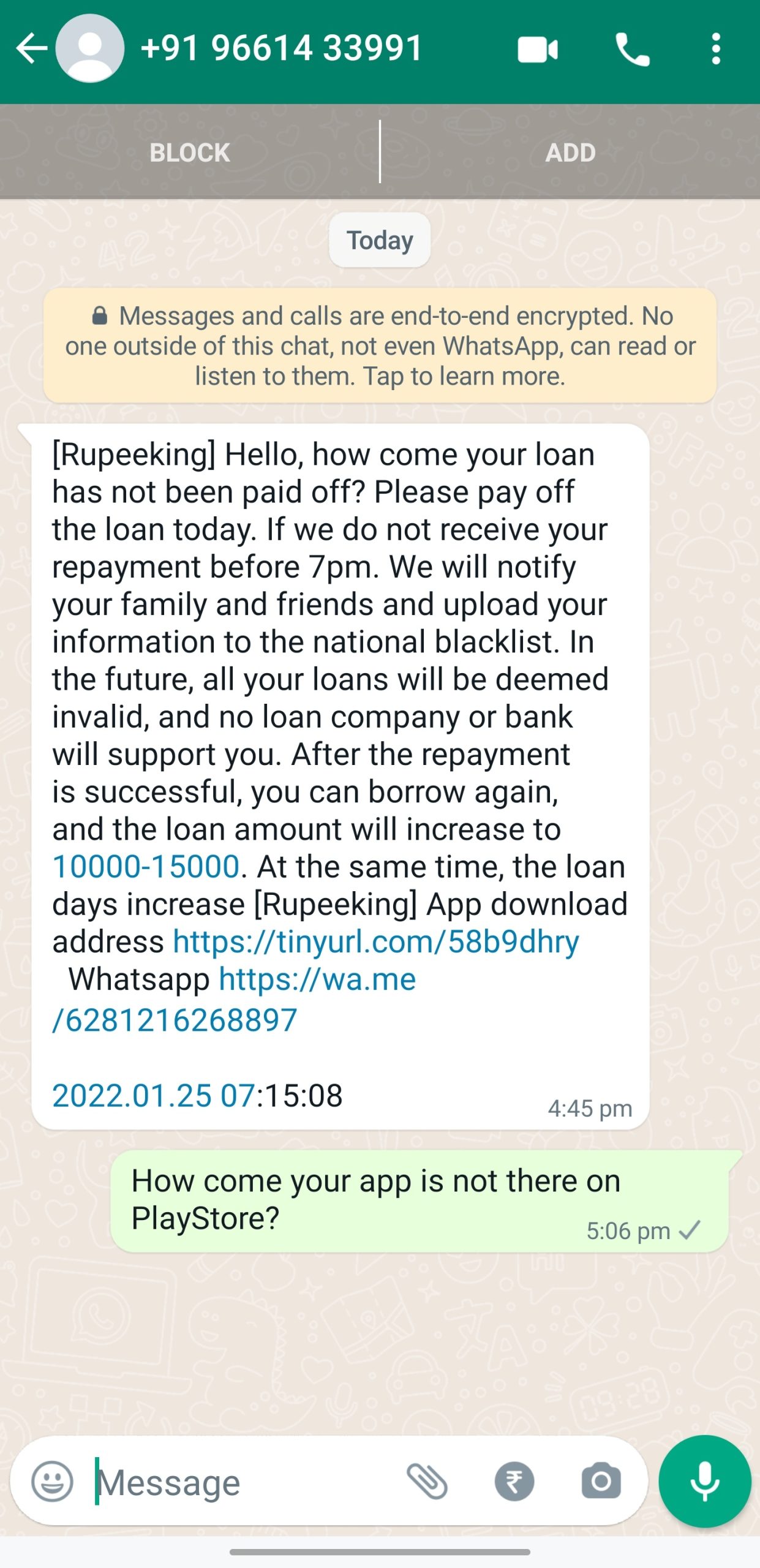 I’m getting WhatsApp messages about some loan which I have not taken from different unknown numbers telling themselves as Rupeeking to whom messages are also not going. They’re saying to pay off some loan by 7pm if not they will call all the numbers in my contact list.