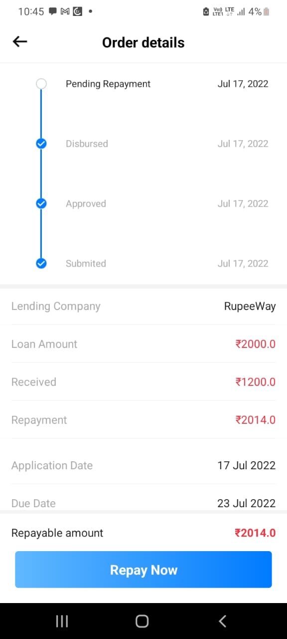 I just downloaded the app and wanted to see what the app was and then without any confirmation the app credited 1200 and are demanding 2014 as repayment within 1 week. They also took my contact details and are harassing me to pay the unreasonable amount. They gave money on 17th july and forcing me to pay on 23th july