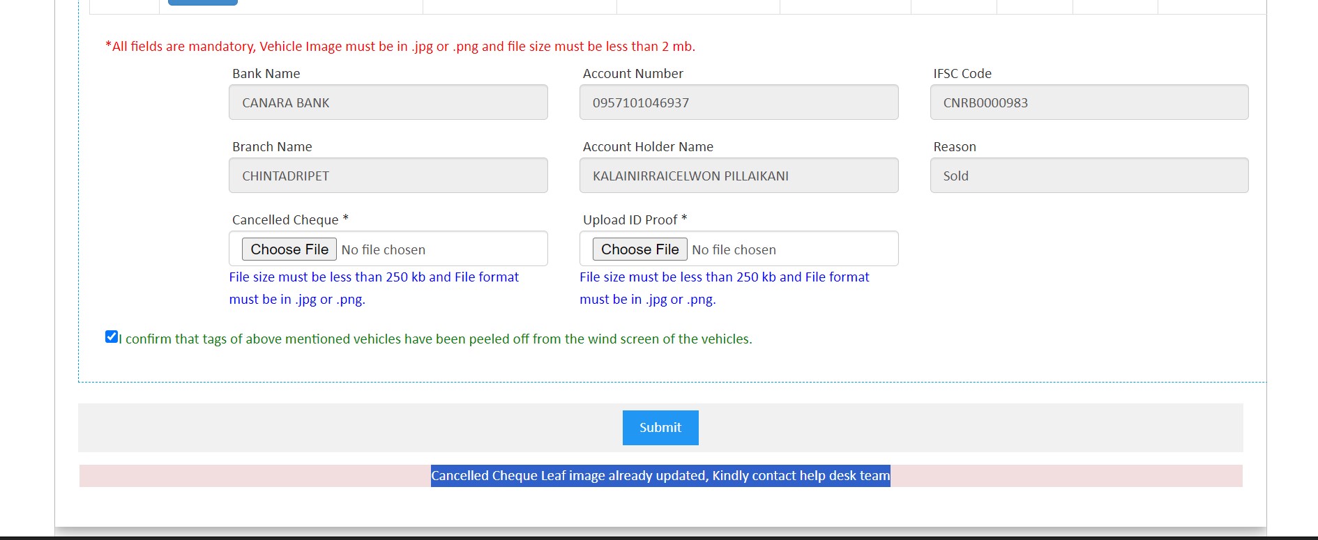 I was using SBI Fastag which was provided to me when I bought a new car from ABT Maruti – Sriviliputhur – Virudhunagar District. Since I was not happy with the service provided by SBI I want to surrender it. But I tried many number of times in app and in the portal but I am unable to proceed due to an error. “Cancelled Cheque Leaf image already updated, Kindly contact help desk team”. When I tried reaching out the customer care, again they are asking me to visit the branch and when I asked the branch they are asking me to connect with the Customer Care. As an individual how many times I should be roaming to surrender a fastag.