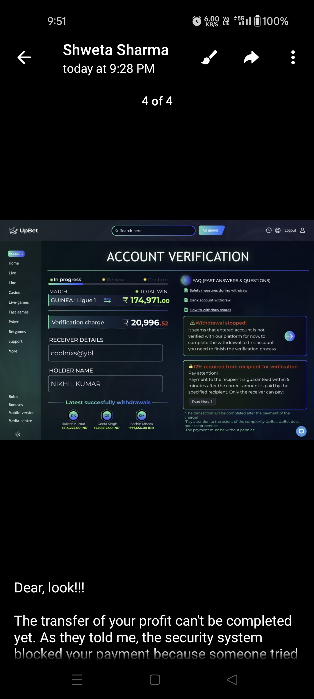 called Shweta Sharma an Investor on Instagram ads…. I’d made a payment of Rs. 10900/- for investment and about 3-4 hour, she send me a big sum of money that she won after investing my money. But, for to receive payment, she mentioned, that, “The Platform wants to verify the recipient, and hence, you need to pay 15% verification charge from your UPI ID, because someone tried to withdraw your won money. After this instance I don’t thing so anyone can trust. The person is not been responding after countering with huge bag of questions. Its a TRAP. please don’t fall in this.