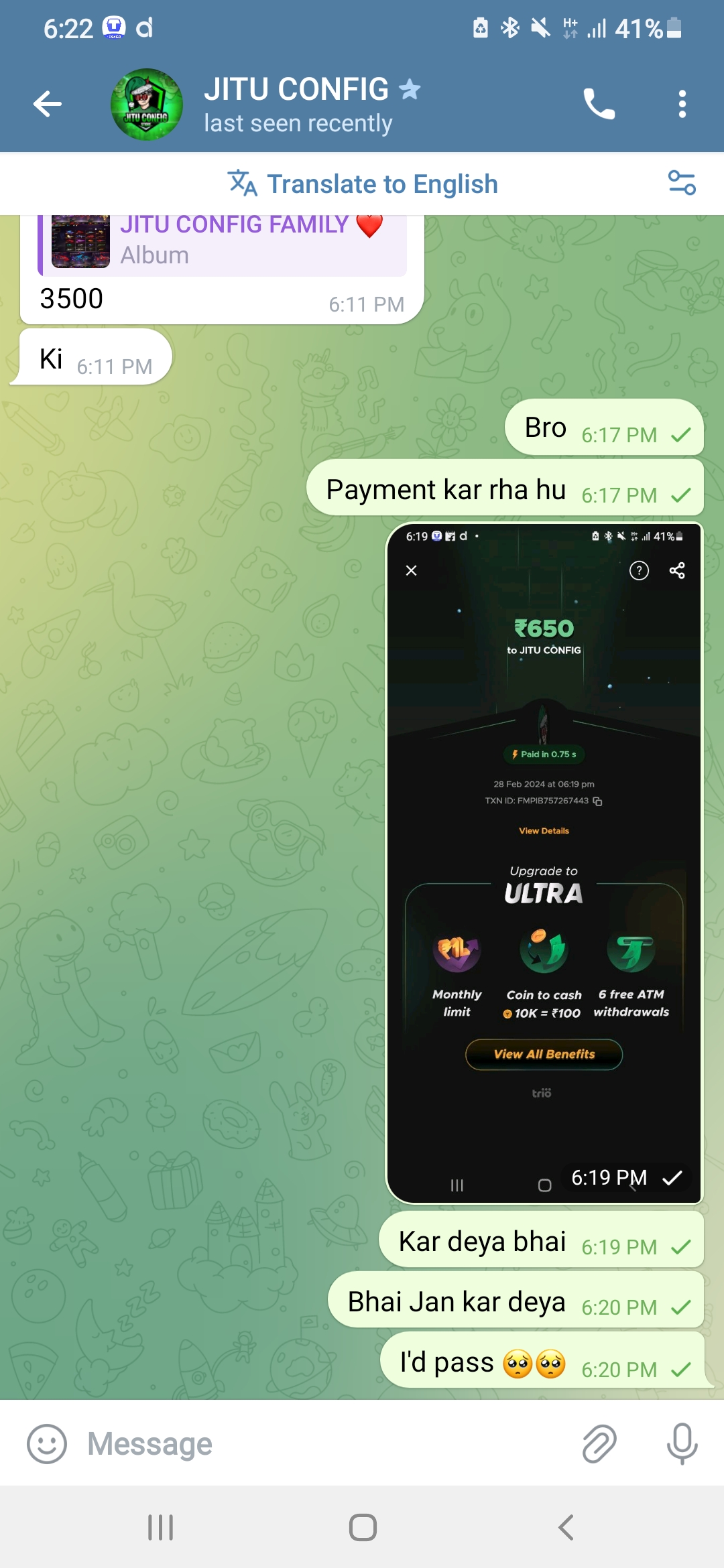 There was a telegram channel name :- JITU CONFIG FAMILY❤ he was saying that he is selling a id in ₹650 rupees i said him i will buy it and i pay him he said me wait I’m giving you id and pass but he give Me nothing and change his name also thankfully i have some screen shots proof that’s all I hop you all will help me
