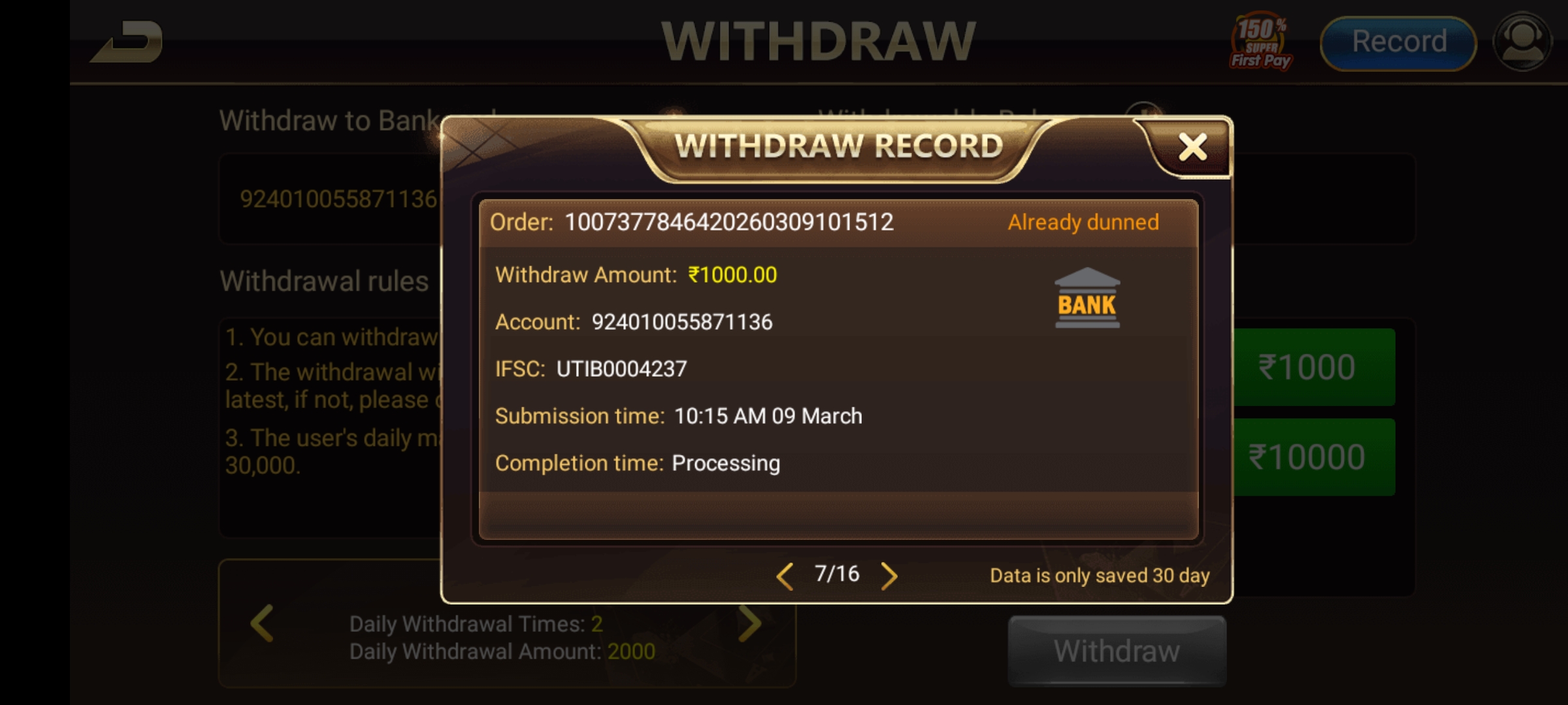 I have deposited upto 10000,while playing and winning withdrawal done some amount and from 9th march tried to withdraw 7000 as per their restrictions and terms .everyday mentioned already dunned their online service is system automated