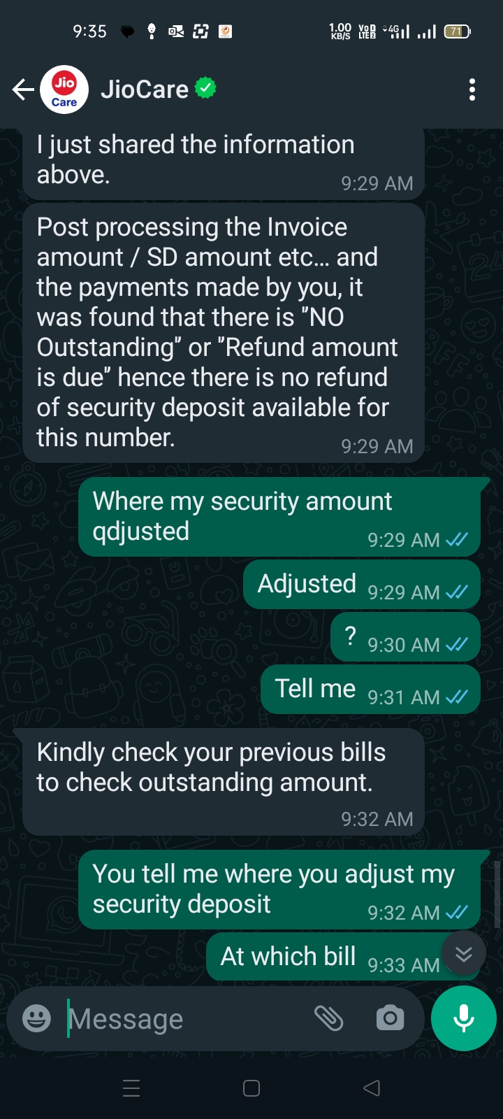 I deposit my security amount rs 500 in jio towards my jio postpaid no. I discontinued jio postpaid but they are not refund my security deposit. I request customer care but they are not able to tell where they adjust my security amount.
