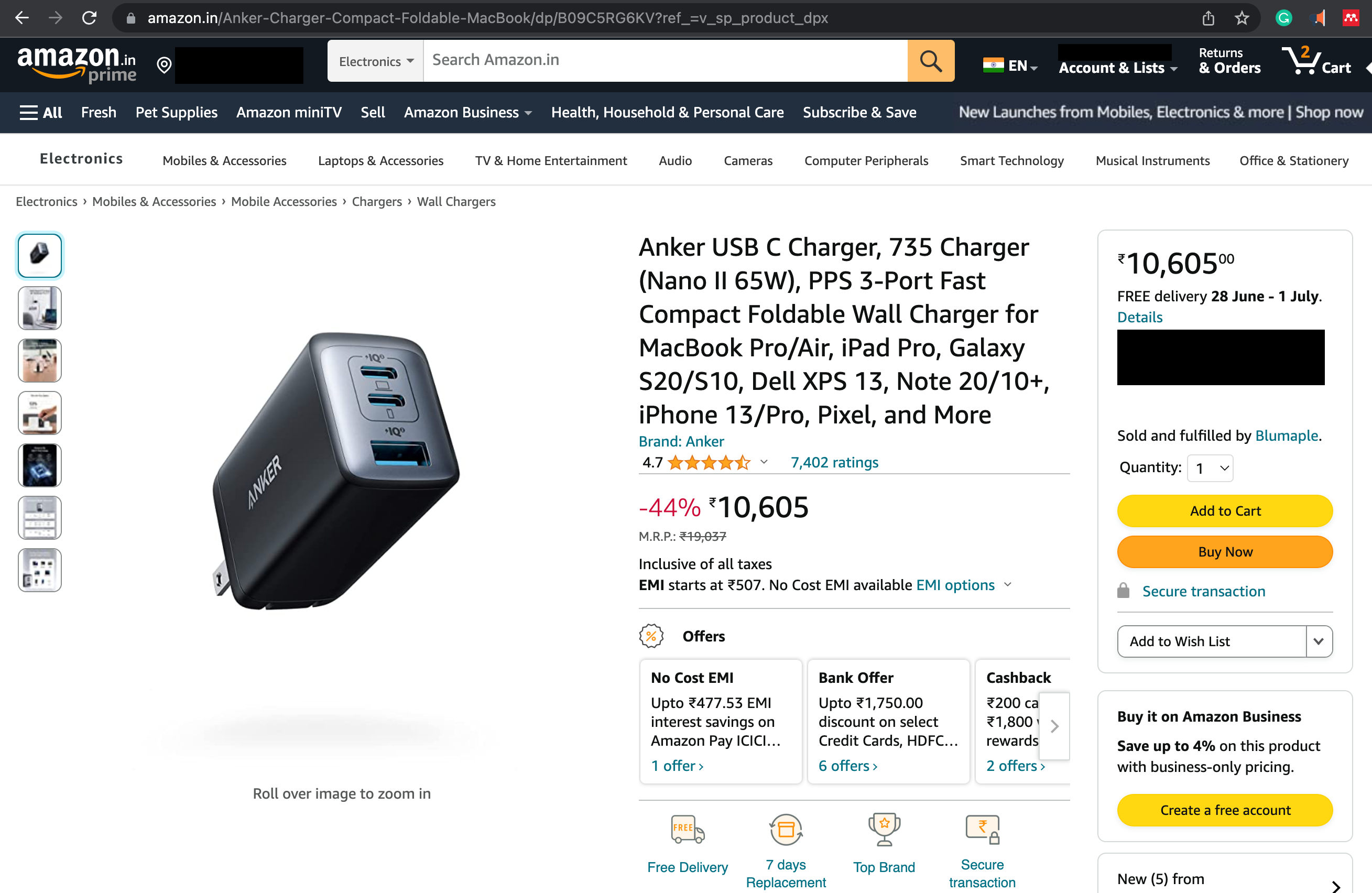 Seller Blumaple on Amazon has an MSRP of a Type-C charger from Anker for 19,037 rupees when the original MSPR is 4,923.64 rupees.