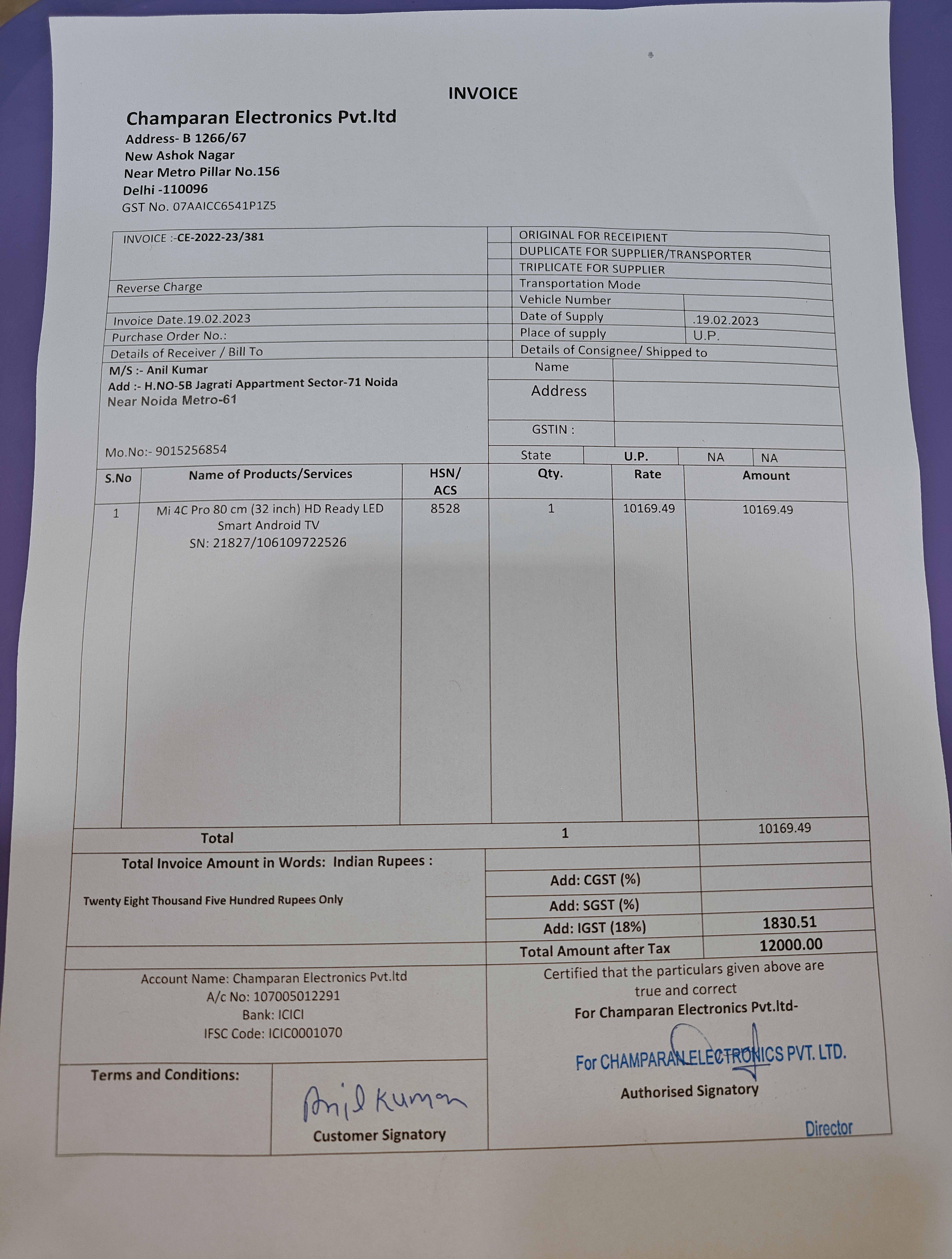 Dealer detail from where I purchased the TV: Champaran Electronics Pvt. ltd. , B 1266/67 New Ashok Nagar Delhi-110096