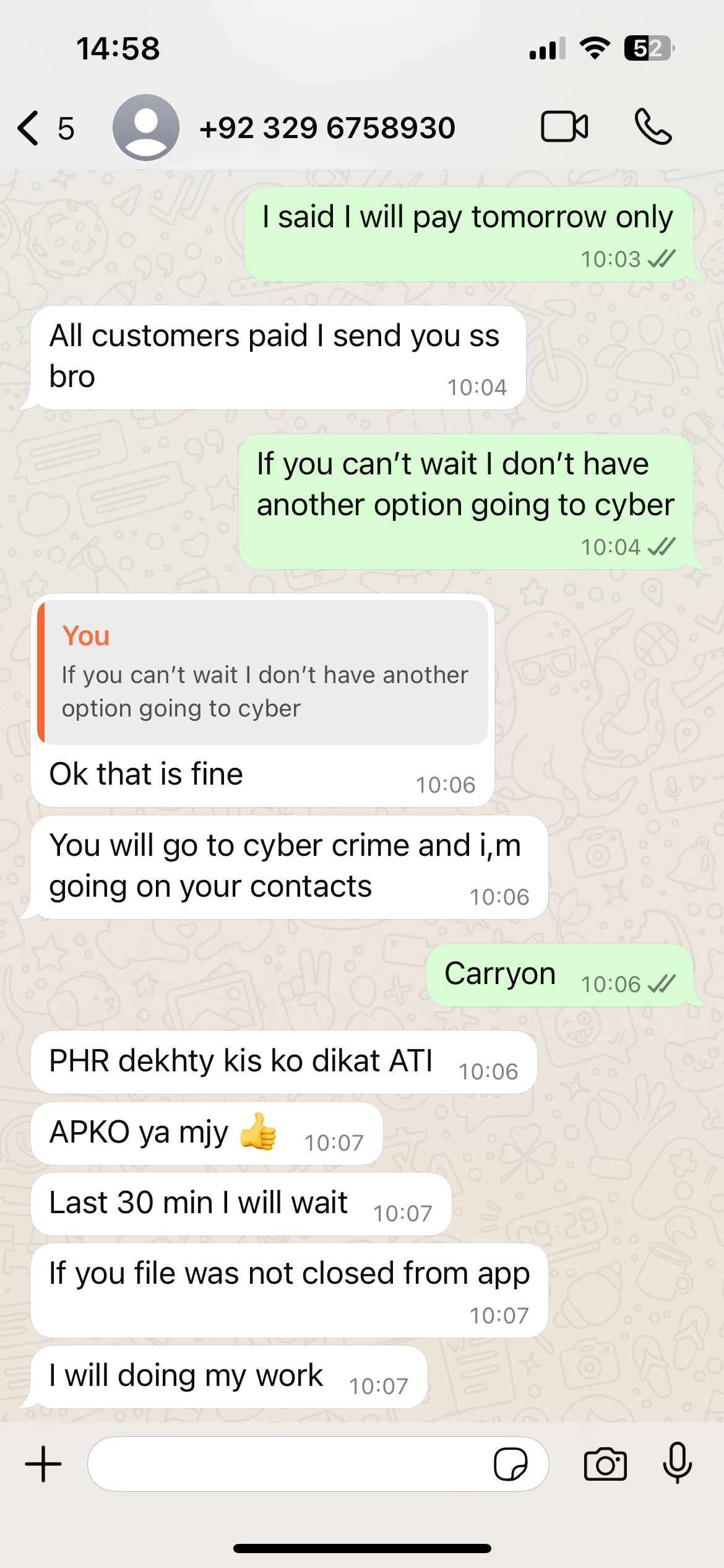 I tried apppling for loan in sheikh loan app. When I entered a details they shown me some offers which is 10000 Rs loan 3 emi repayment . I said ok to move further . After that they showing me 10000 Rs approved for 7 days 5600 will be credited to your account and 4000 Rs service charge. After seeing that message I sent out few mails to cancel the loan. But next day they credited with out my knowledge. Now on 6th day morning form 8 am they started calling me from international numbers mainly from Pakistan and sending my morphed pictures and blackmailing me to pay 10000 Rs. If I fail to pay they going to send those pictures to all my contacts.
