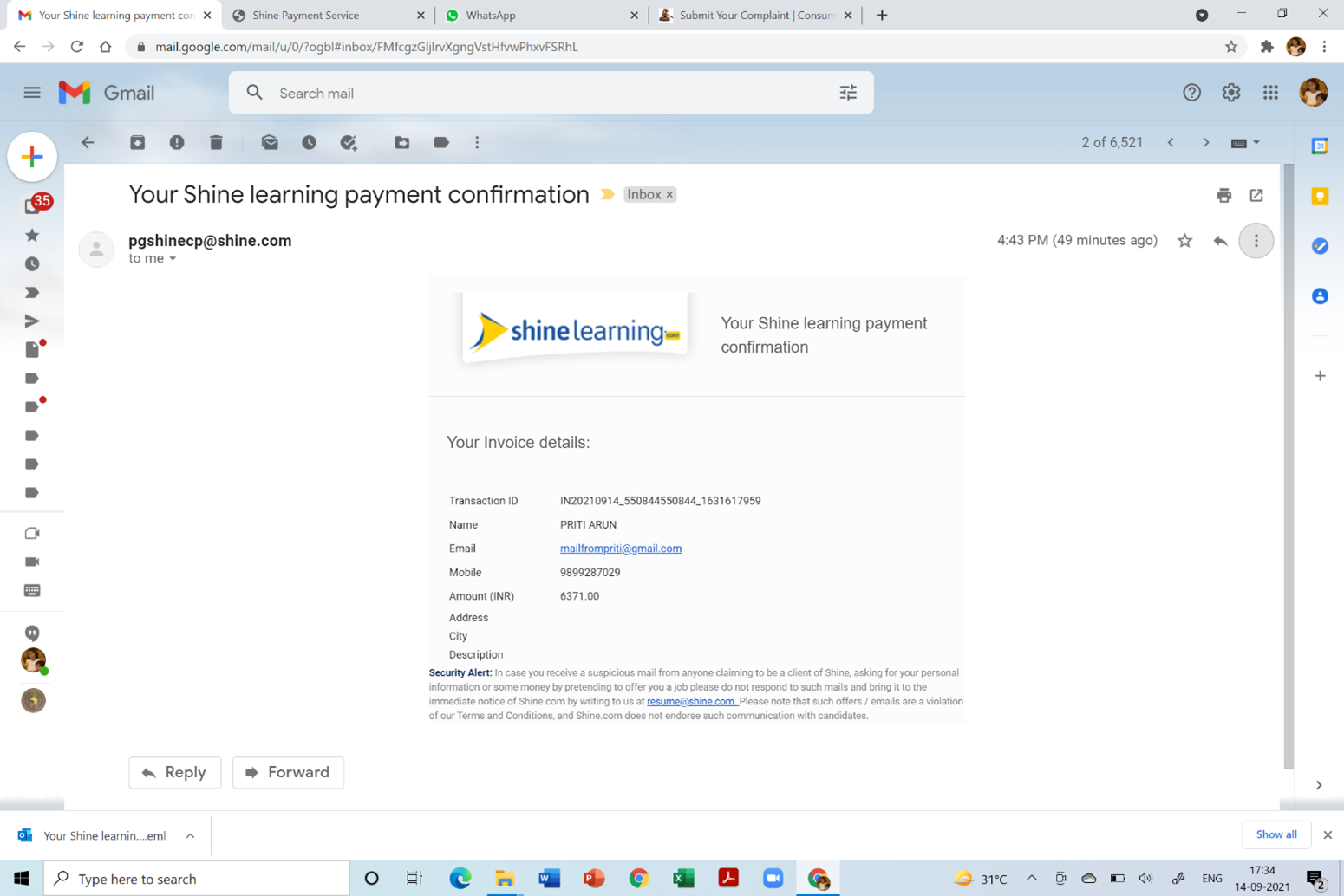 Got calls saying that they are representatives of Shine.com – a portal that will help me find a job and will help me get at least two job interview calls every week. For that they made me pay 3300/- yesterday (13/09/21) as registration and then some more charges (Rs. 6300/-) for helping me to improve my profiling, etc. today (14/09/21).