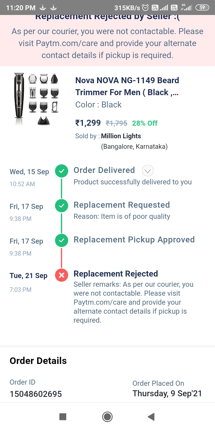 Maine pyatm se trimmer order kiya tha 09 sap ko par usame kuch kharabi hai chalta nahi hai maine use return ke liye place kiya to har din order recived karne ke liye Message aata hai par koi huvaa aata lene ke liye nahi call karata costumer service kuch thik nahi hai kuch bhi support nahi bakwas hai sab 1 mahina return nahi huvaa