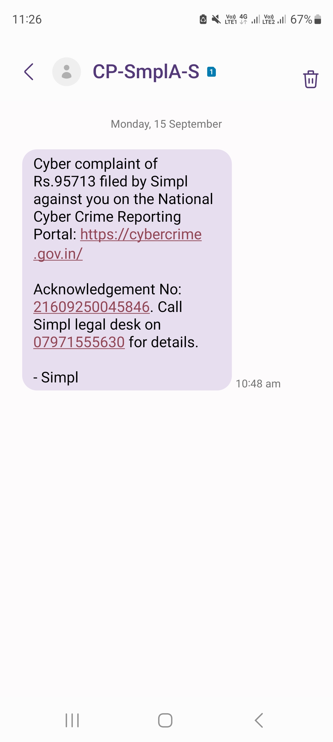 I have a payment pending of 8300, which is pending due to financial crisis at my end. Today I get a message from simpl that they have filed a cyber crime against me for rs 95713 rs..not sure why this was filed and what is the money taken.. they are harassing too much and falsely updating my name under cyber crime.. they are mentally torturing a lot and falsely defaming me