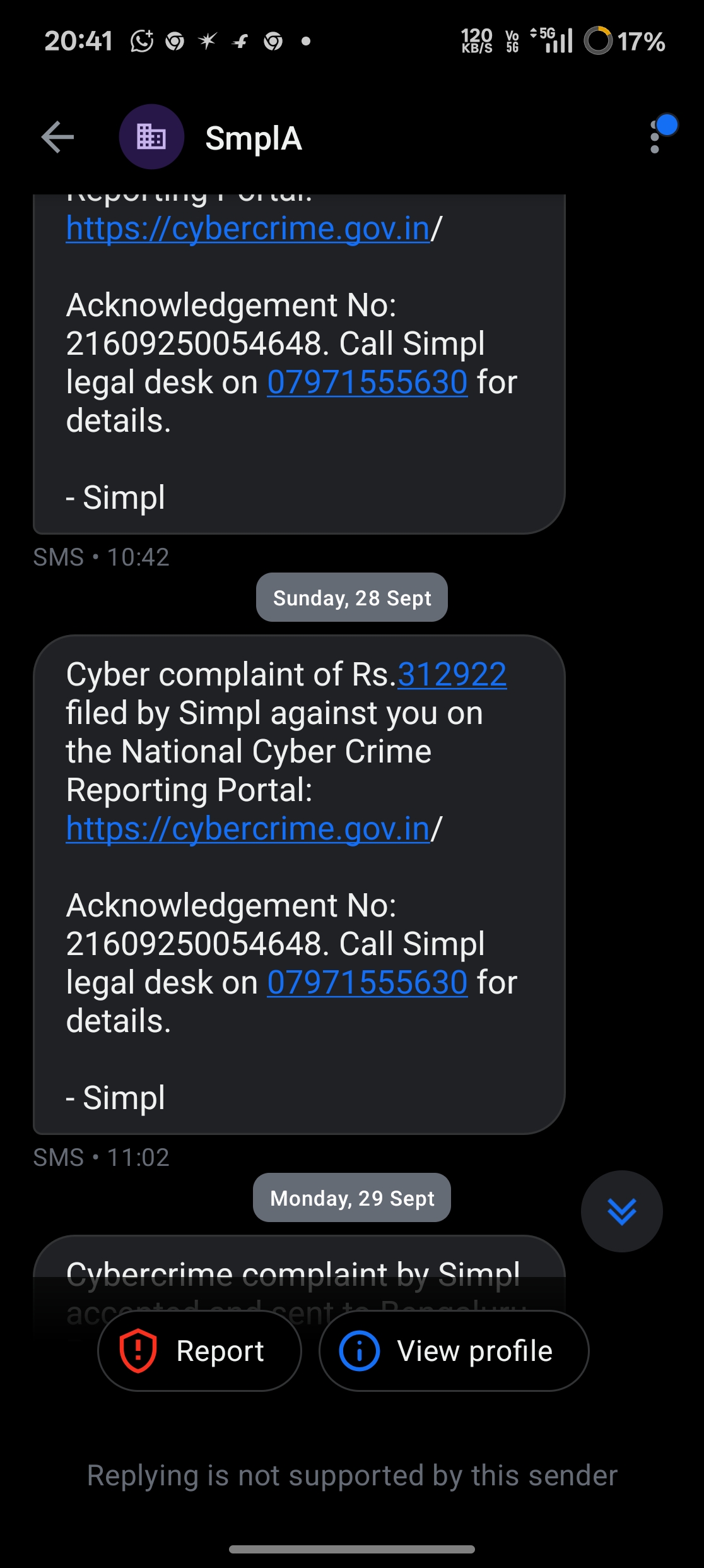 I have a payment pending of 6500inr, which is pending due to financial crisis at my end. I am ready to pay but unable to contact them also many have paid via app but still they are sending harrasment. Today I get a message from simpl that they have filed a cyber crime against me for rs 312992 rs..not sure why this was filed and what is the money taken.. they are harassing too much and falsely updating my name under cyber crime.. they are mentally torturing a lot and falsely defaming me