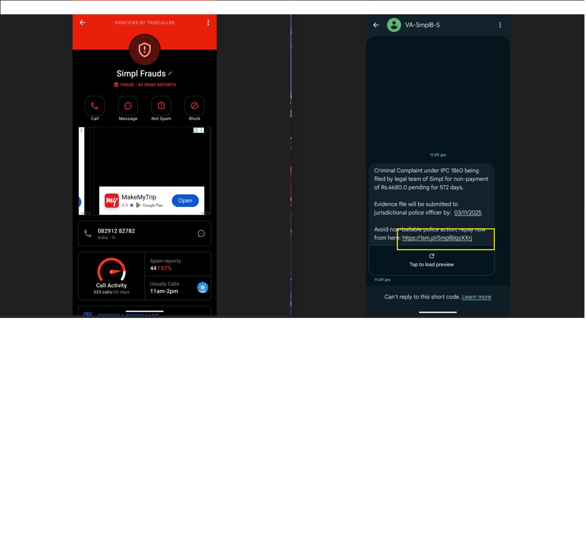 I am receiving repeated threatening messages regarding a pending Rs. 6680 bill from SimplePay, despite never having used their services. I checked my PAN card for loan details because I thought I might have forgotten to make a payment, but found no record of the debt. Since my PAN is not registered with them, I’m unsure how they obtained my information. I have not clicked any links in their messages due to fraud concerns. Details image are uploaded below.