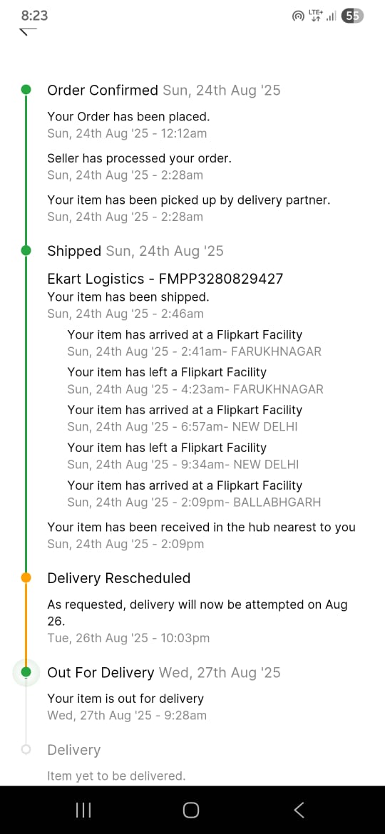 respected sir actual day of deliver of my product worth of 69039/- is paid on Flipkart. delivery of the product date is 25/08/2025 they did not deliver till the date 27/08/2025 three days every day they are displaying in app out for delivery and rescheduling themselves.