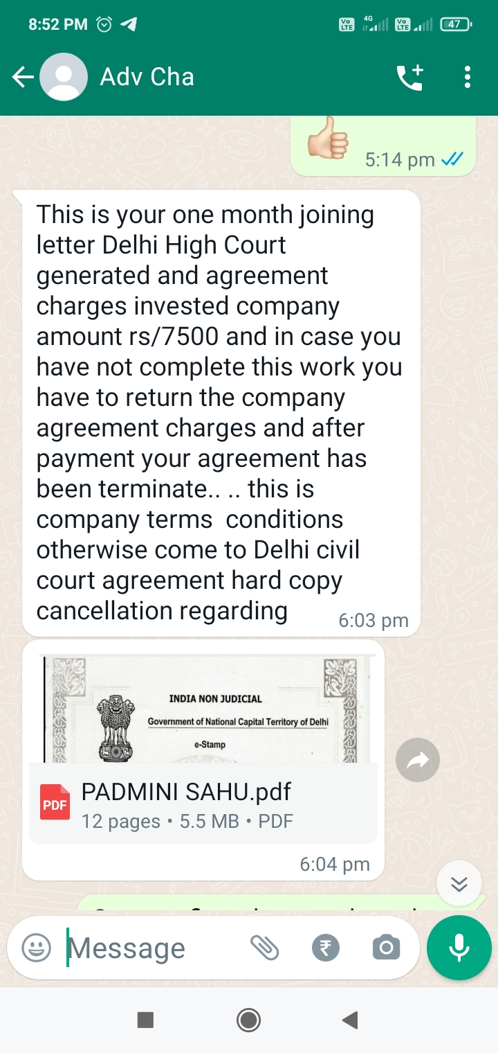 The name vishal sukla first send me the message that I am found your details from found it app you are selected for the freelancing job. Then he say that I will give you 15k if you submit these 150 resumes in 3days.then he say that they will give 7500 and another 7500 is cut off from my salary because this is the agreement charges. After completing my work when I was sent to him he says that you have to pay 3750 otherwise I will take strong action against you in the Delhi civil court. They started blackmailing me. I am afraid because they took my aadhar card and signature. And blackmailing me both the adv Karan and vishal shukla. I will give the agreement they sent to me.