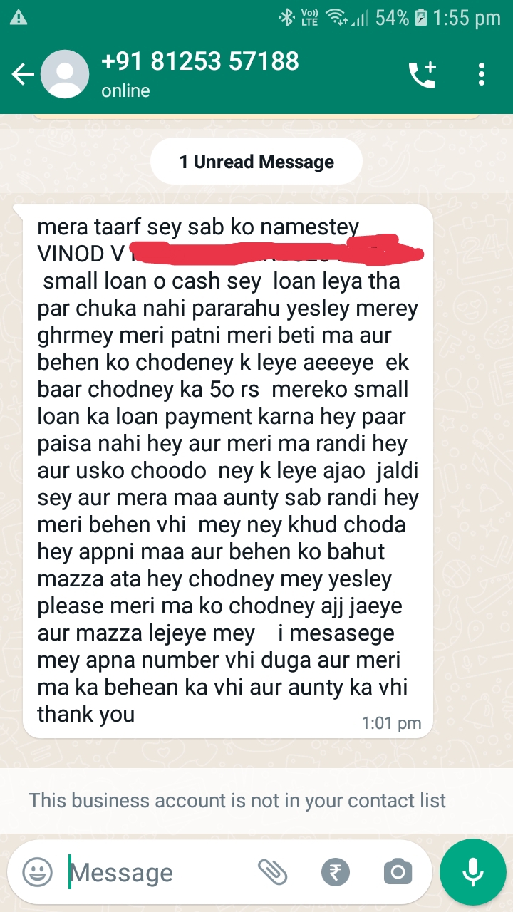 Small Loan O cash app i taken 7001 rs for 7 days on 16th nov and on recovery day 23rd nov their recovery agent started chasing from morning 9:30.i requested him will done bfore 6 pm but he atarted abusive language messages on my contact lists whats app and started harassing me each 10 mins from multiple location mobile no.even whats app voice recordings.i have a whats app voice messages and the messages sent to my colligues,relatives and friends.i lodged a police complaint against the finacial company and the app.