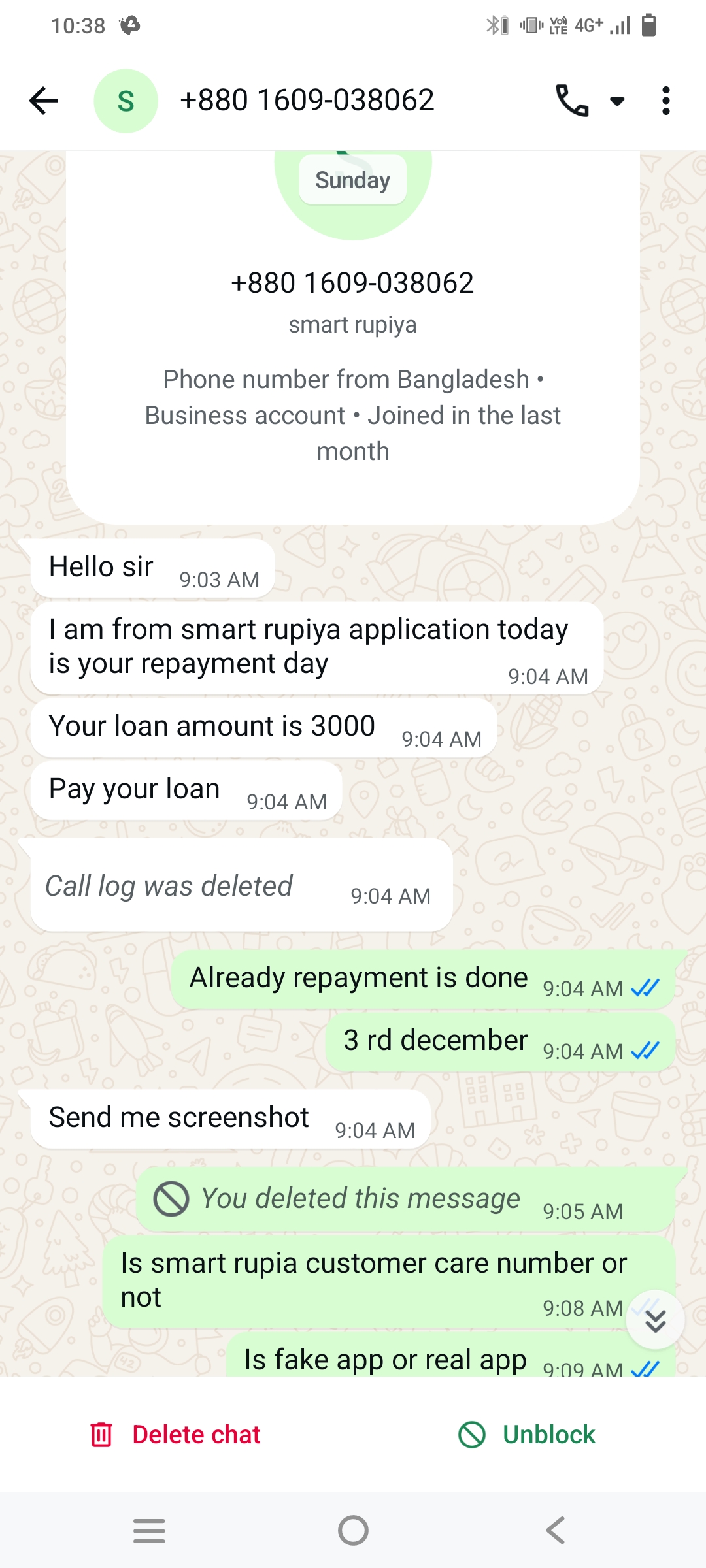 I have installed the app smart rupia and got loan of 1800 rupees directly to the my account without any information and proofs.I have not apply the loan just iam seeing the loan structure.And complete the repayment 3000 rupees through Smart rupia app.but not showing the repayment status.Now iam getting more messages from WhatsApp or callis from unknown persons. I did not apply the loan.They are saying that they will call my personal contacts from adress book.Iam completed repayment also.They are saying not completed.plese slove this fraud app.