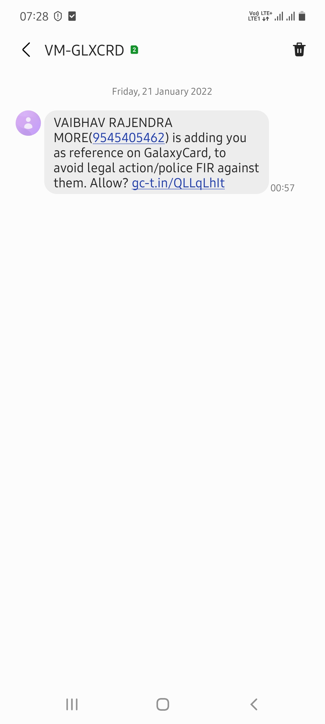I have received SMS from VM-GLXCRD saying that VAIBHAV RAJENDRA MORE(9545405462) is adding you as reference on GalaxyCard, to avoid legal action/police FIR against them. Allow? gc-t.in/QLLqLhIt. I don’t know who is VAIBHAV RAJENDRA MORE and I have never given any consent to anyone to add me as reference. So please take necessary action regarding this.